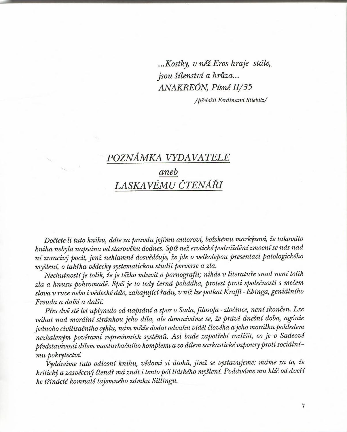 Ex. č. 356 z neudaného počtu výtisků. Z francouzštiny přeložil Ladislav Matějka, v úvodu předmluva Gilberta Lelyho. - V tiráži nakladatel uvádí, že kniha je určena jen pro subskribenty, veřejné nabízení a vystavování zakázáno a prodej pouze přes adresu nakladatele. Knihkupci musí mít své objednávky podloženy seznamy subskribentů. Mladistvým do 18 let je prodej výslovně zakázán! ... - Původní celokožená vazba v barvě temně vínové se zlaceným názvem na přední desce a ve hřbetu.