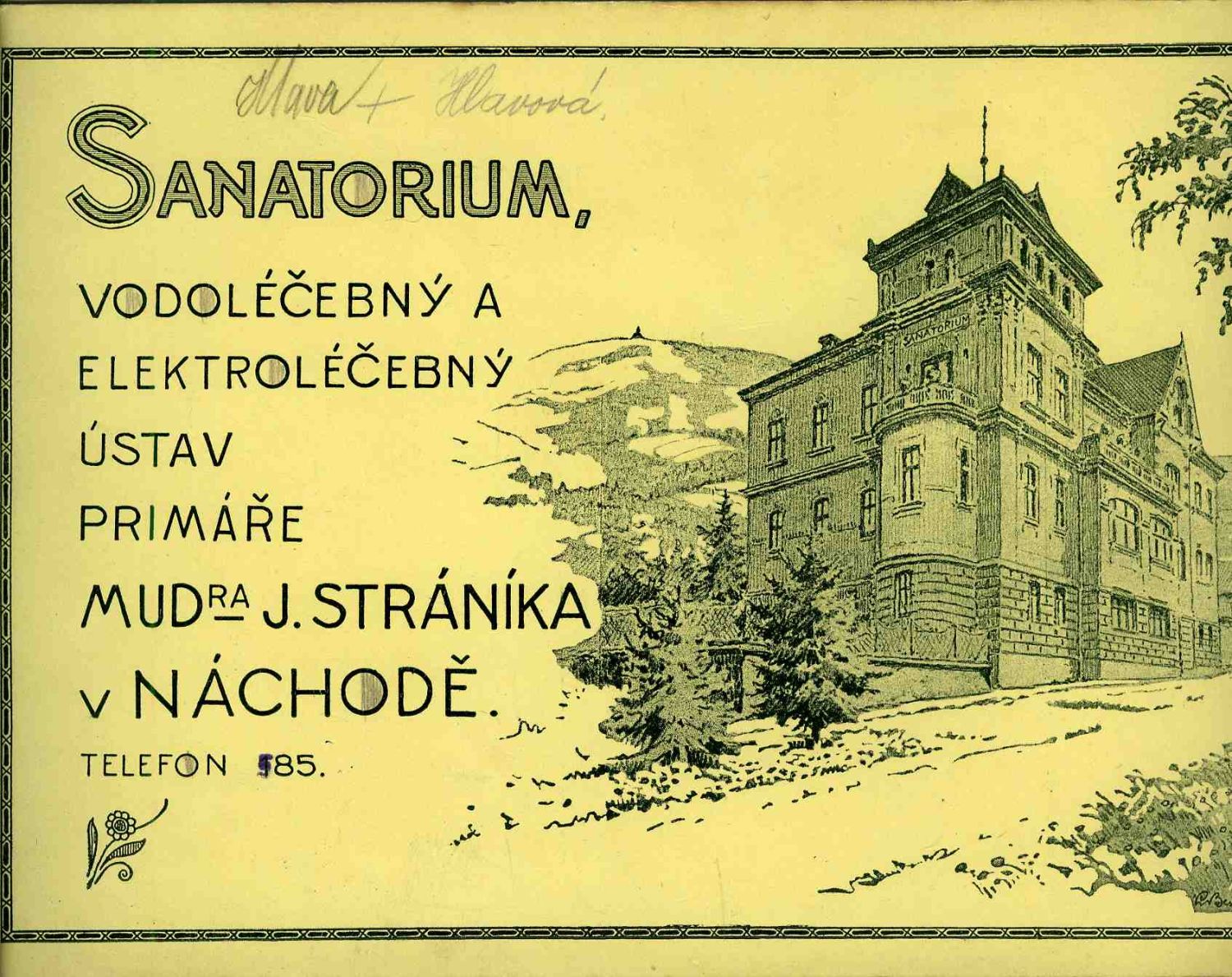 Sanatorium, vodoléčebný a elektroléčebný ústav ptimáře MUDra. J. Stráníka v Náchodě.