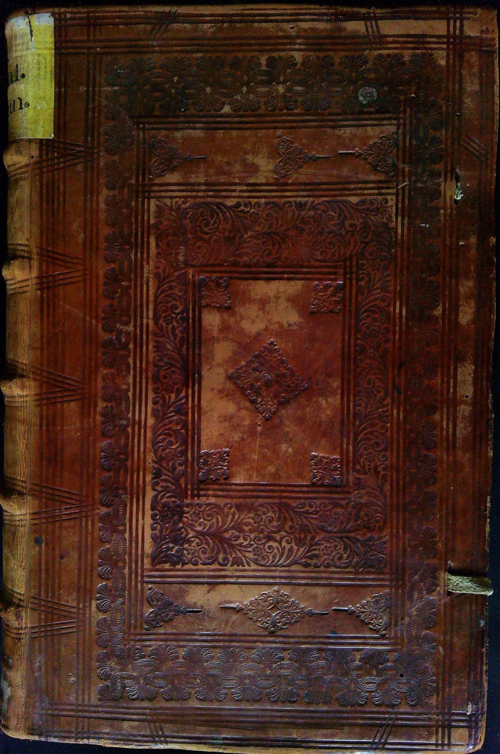Dobová vazba s kartonovými deskami potaženými hnědou teletinou, desky zdobené slepotiskem. Vnější geometrický dvojitý rám ze 4 a 3 linek, uvnitř rámu dvě zrcadla zdobená rostlinným ornamentem oddělená od sebe rámem ze 3 linek, uvnitř vnitřního zrcadla rostlinný ornament. Dvě vázací tkanice (na přední desce chybí horní, na zadní torso spodní), ve hřbetu 5 vazů, barvené ořízky. Vazba ohmataná a místy odřená. V prvním poli hřbetu starý pap. štítek s názvem, v poli spodním. Na tit. listu prov. přípis perem z roku 1714 ("... Bibliotheca Minorum in Monte Mariano ...") a razítko "Bibliotheca Conventus Fuduensis Frauenberg". Papír místy zahnědlý.