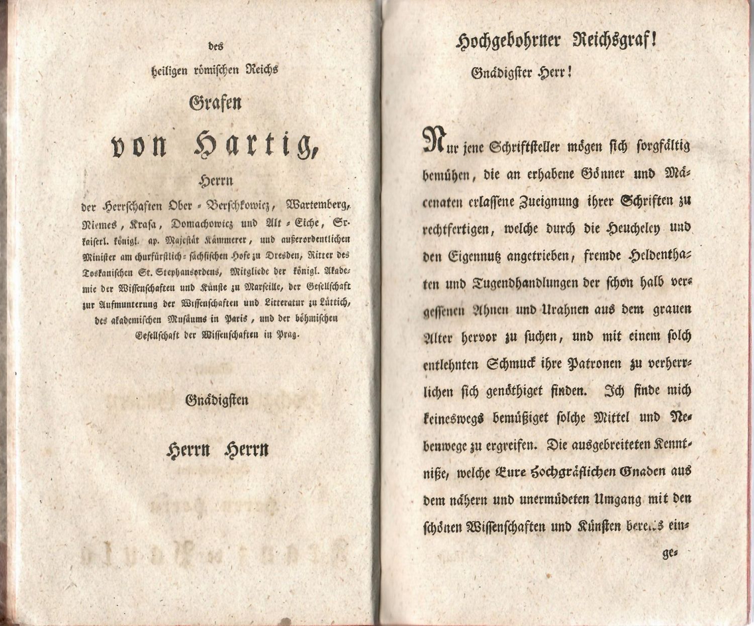 Německý text a české názvy obcí a měst tištěné švabachem, latinský text antikvou, mrtvá záhlaví. Na tit. listu mědiryt. viněta od J. Balzera s vedutou Chrudimi, na líci dalšího listu nad tištěnou dedikací mědiryt. erb Františka de Paula hraběte z Hartigu. Dva dřevořezové vlysy.