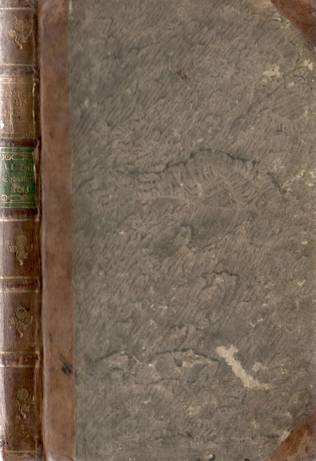Původní vazba s kartonovými deskami potaženými mramorovaným papírem, kožený hřbet a nárožnice, ve hřbetu 5 vazů, ve druhém poli hnědů původní kožený štítek s tlačeným a zlaceným názvem díla, v poli třetím štítek zelený s tlačeným a zlaceným názvem dílu, v ostatních polích tlačený a zlacený rostlinný ornament, červeně barvené ořízky. Mramorovaný pokryv desek místy odřený, poslední tři listy odpadlé z knižního bloku.