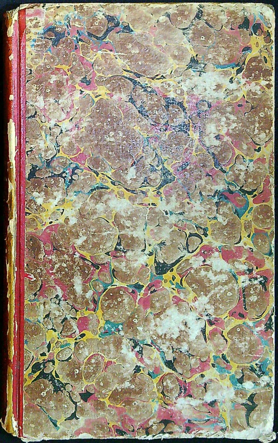 Dobová kartonová vazba potažená mramorovaným papírem, ve hřbetu vínově červený papír imitující kůži s tlačeným a zlaceným názvem mezi rostlinnými ozdůbkami, barvené ořízky. Vazba ohmataná a ve hřbetu na několika místech odřená, papír zahnědlý.