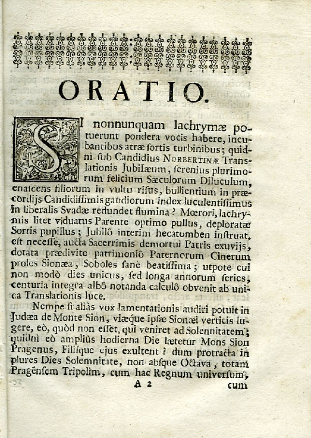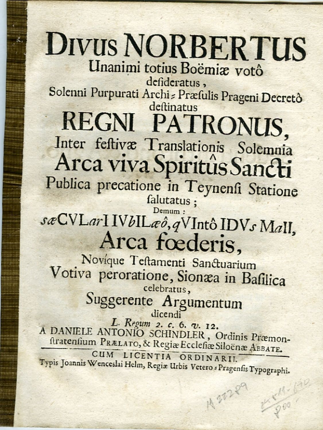 DIVUS NORBERTUS Unanimi totius Boëmiae voto desideratus, Solenni Purpurati Archi=Praesulis Prageni Decreto destinatus REGNI PATRONIS, Inter festivae Translationis Solemnia Arca viva Spiritus Sancti Publica precatione in Teynensi Statione falatus; Demum: sae CVLarIIVbILaeo, qVIinto IDVs MaII, Arca foederis, Novique Testamenti Sanctuarium Votiva peroratione, Sionaea in Basilica celebratus, Suggerente Argumentum dicendi L. Regum 2. c. 6. v. 12.