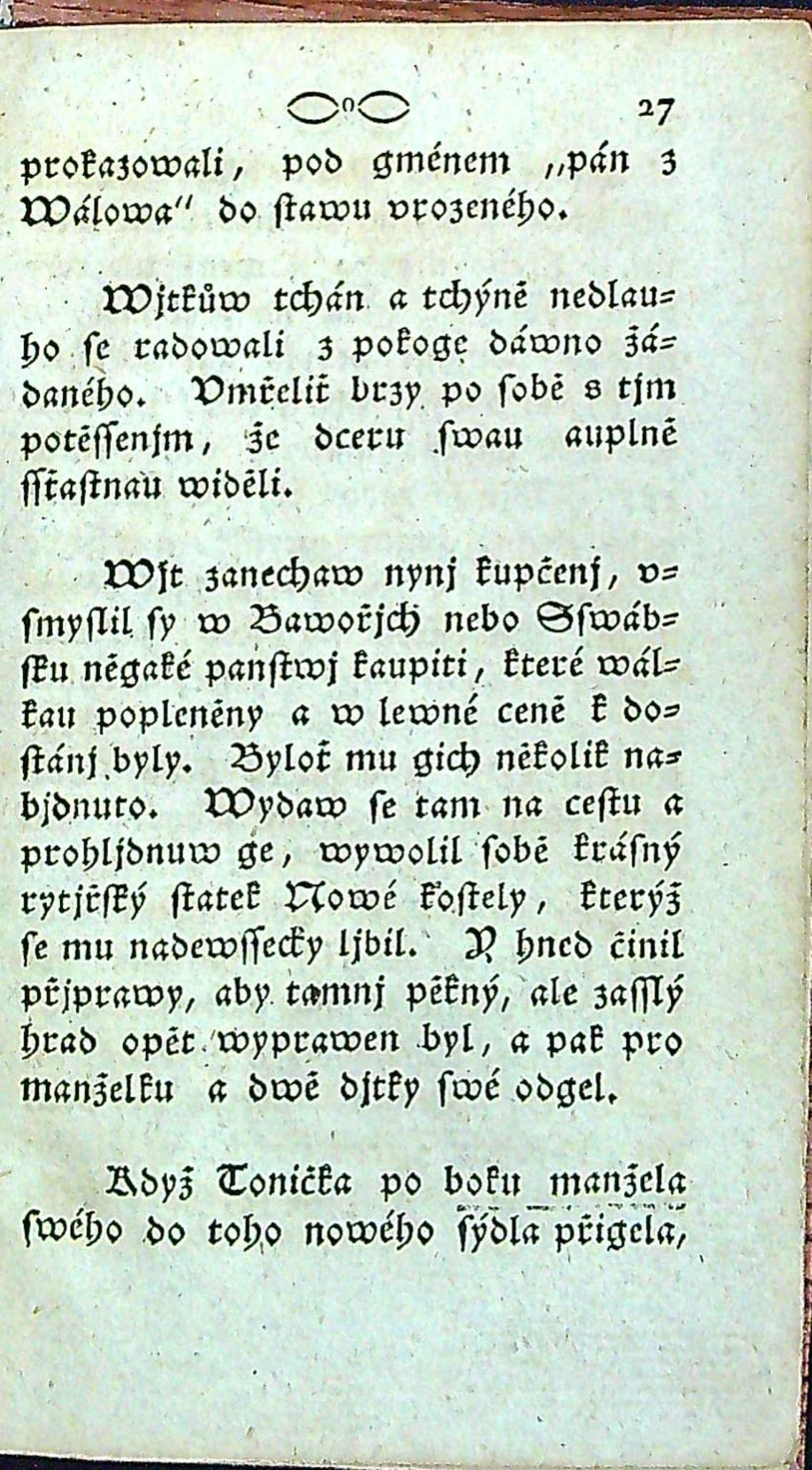 Tištěno švabachem, titulní list olemovaný rámečkem z rostlinného ornamentu, viněta s vyobrazením putti na tit. listu, v záhlaví folia a2 dřevorytový vlys, koncová viněta, uprostřed horního okraje stran mezi ovály kolečko. Z němčiny přeložil Jan Hýbl.