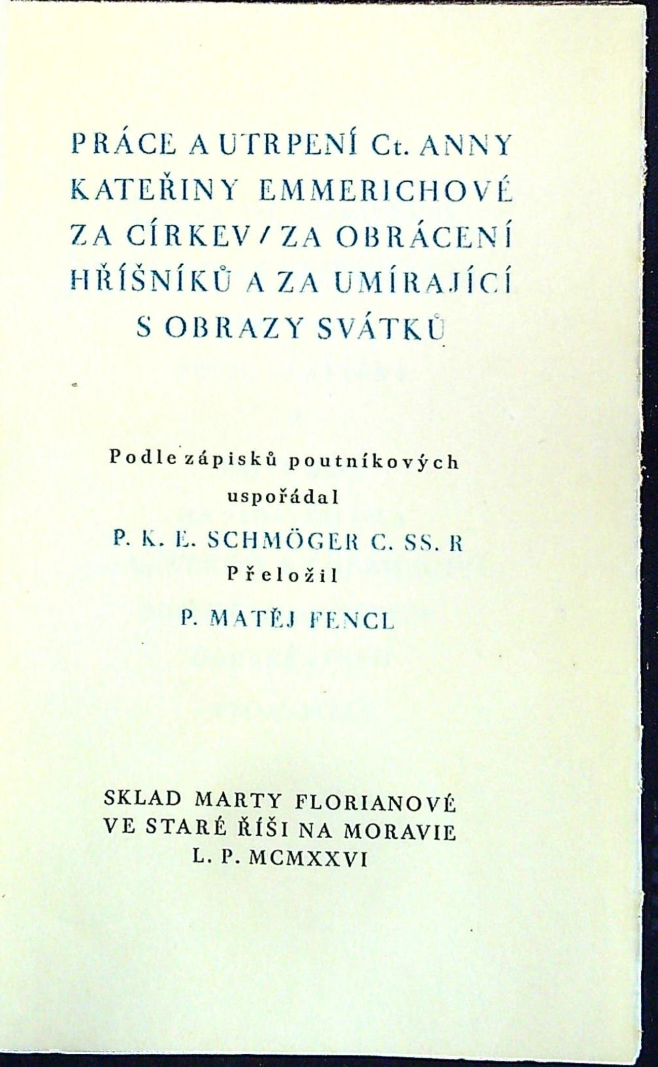 Práce a utrpení Ct. Anny Kateřiny Emmerichové za církev / za obrácení hříšníků a za umírající s obrazy svátků. Podle zápisků poutníkových uspořádal ... Přeložil P. Matěj Fencl.