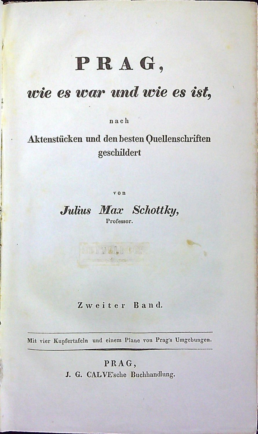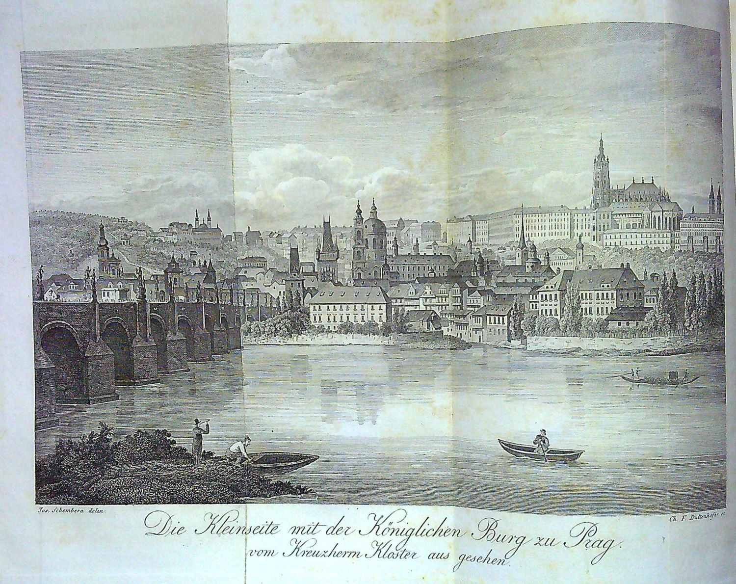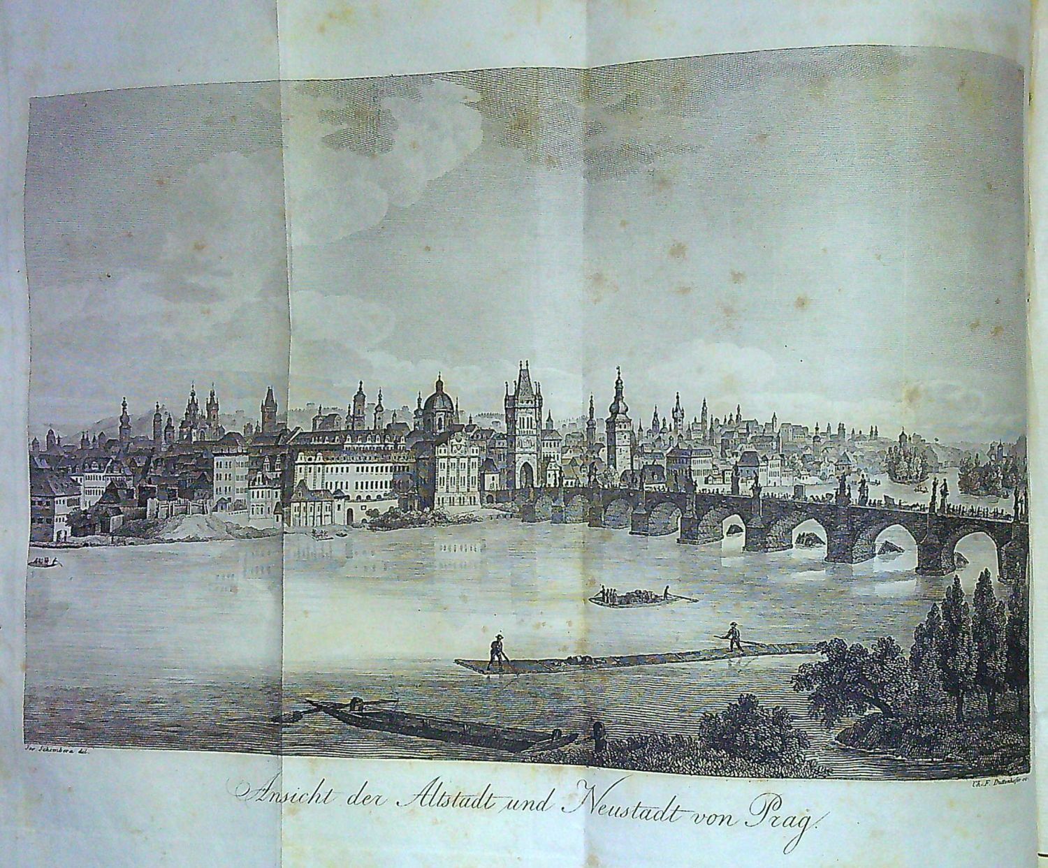 Tištěno antikvou. Na patitulu prvního dílu ocelorytina portálu chrámu sv. Víta, dílu druhého pohled na Hradčany s Malostranskou mosteckou věží a Karlovým mostem. Dvě rozkládací ocelorytinové mapy (plán Prahy a plán okolí pražského), v textu osm ocelorytinových příloh (z toho 3 rozkládací) s pohledy na Prahu, či významné památky pražské. Dobová plátěná vazba, 1. díl mořený hnědou barvou, druhý modrou, ve hřbetu původní pap. štítky s názvy. Vazby místy lehce odřené, pap. štítek u 2. dílu při vnitřním okraje lehce utržený. Na přídeštích a předsákách dobový olejový papír. Na několika listech drobné hnědé skvrnky.