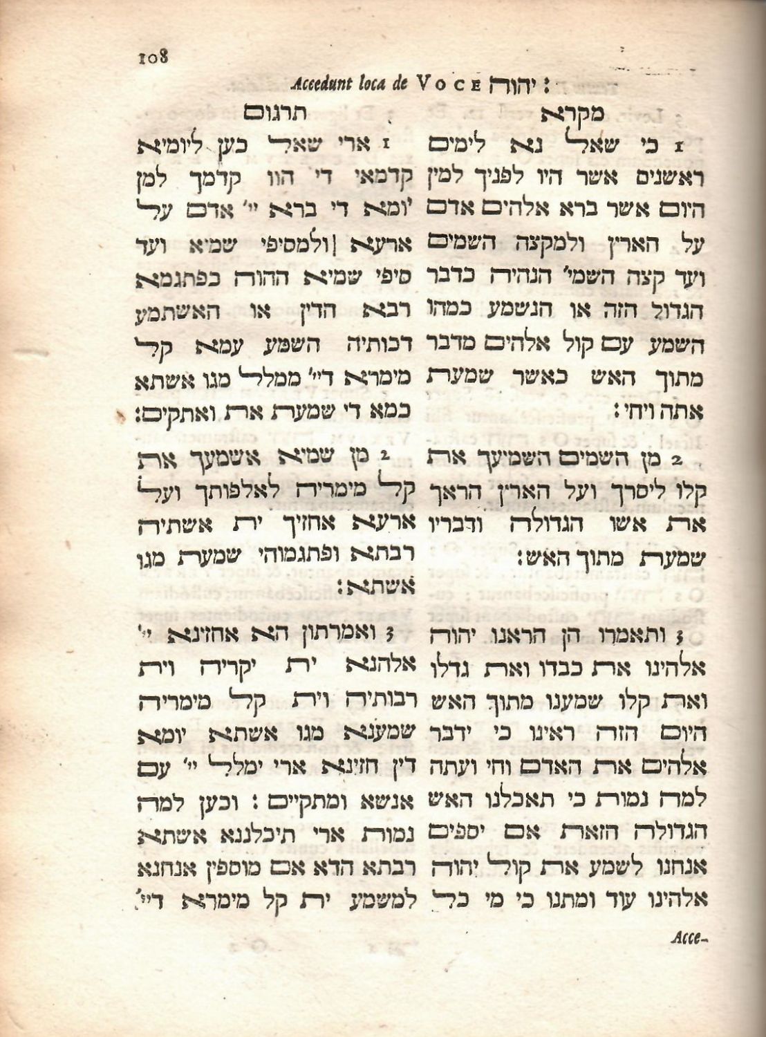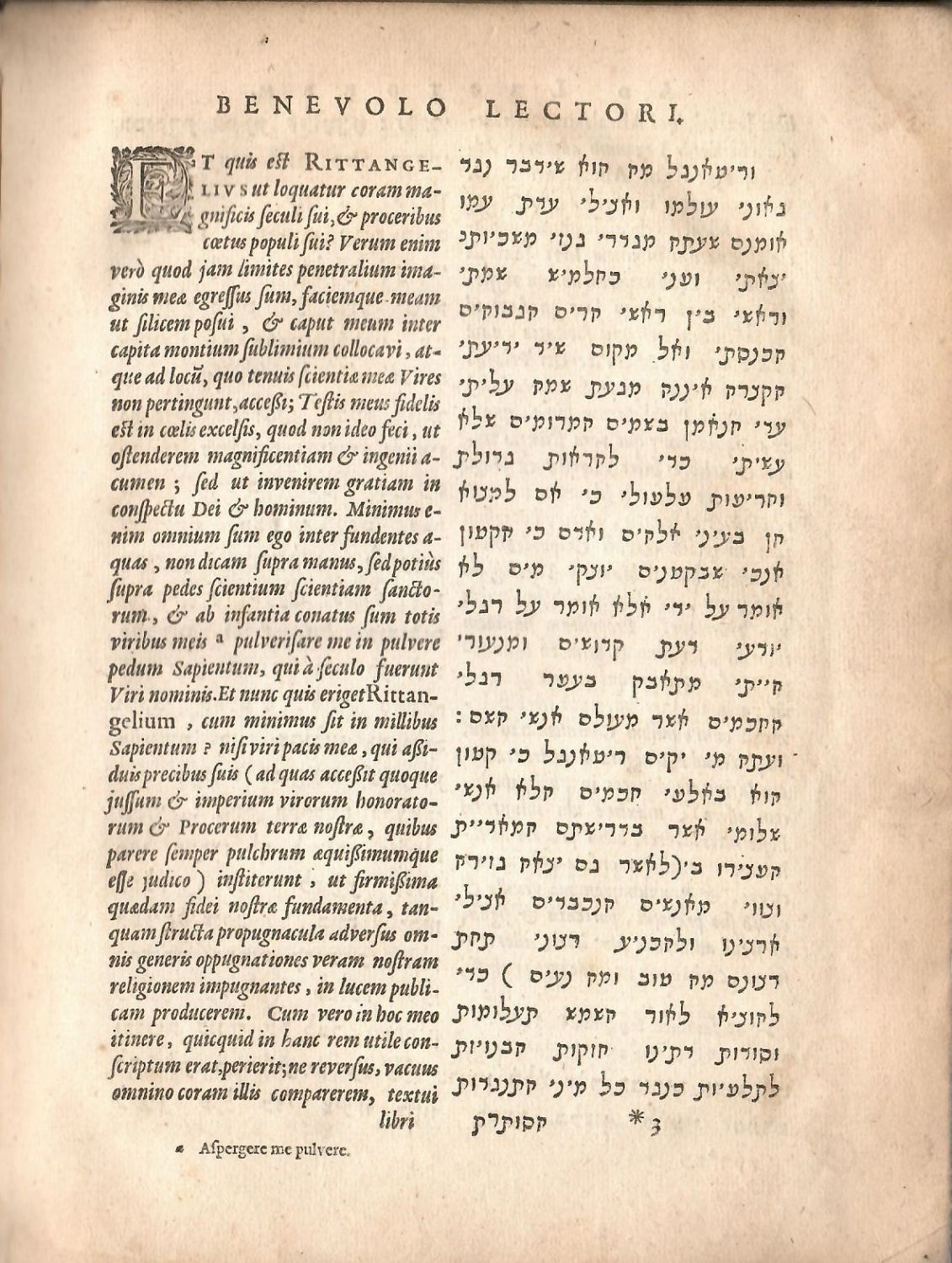 Dvoubarevně tištěný titulní list (červeno-černě), z větší části dvousloupcový tisk, v levém sloupci latinský překlad, v pravém hebrejský originál. Na tit. straně dřevořezová viněta, konturové iniciály na rostlinném pozadí zalomené do výše 3-5 řádek, jednoduché linky, v úvodu předmluva Rittangeliova, na líci poslední nepaginované stránky tištěné opravy.