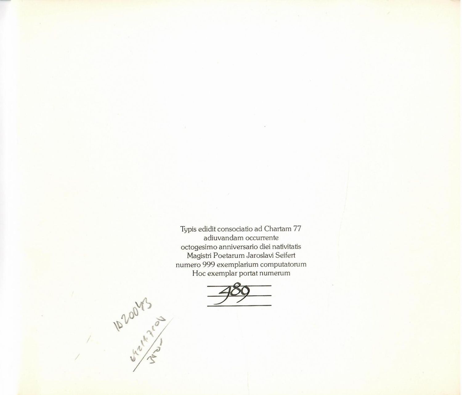 Básně Listopadový déšť a Úryvek z dopisu s anglickým překladem Ewalda Oserse a švédským Josefa Brettschneidra a Harry Järva, vydané k 80. narozeninám básníka. Graf. úprava Kicki Askelin a Jan Kristofori. - Ručně čísl. ex. 489/999. Obálka s faksimilí autorova podpisu v ohybu vybledlá a prodřená, listy čisté. Desky ve hřbetu roztrženy a zcela odděleny od knižního bloku.