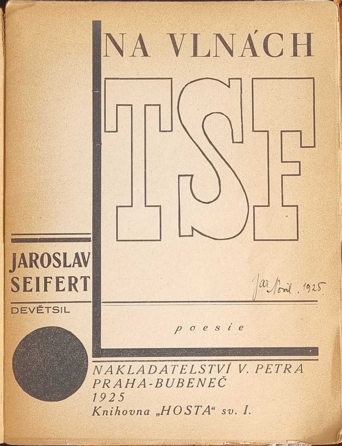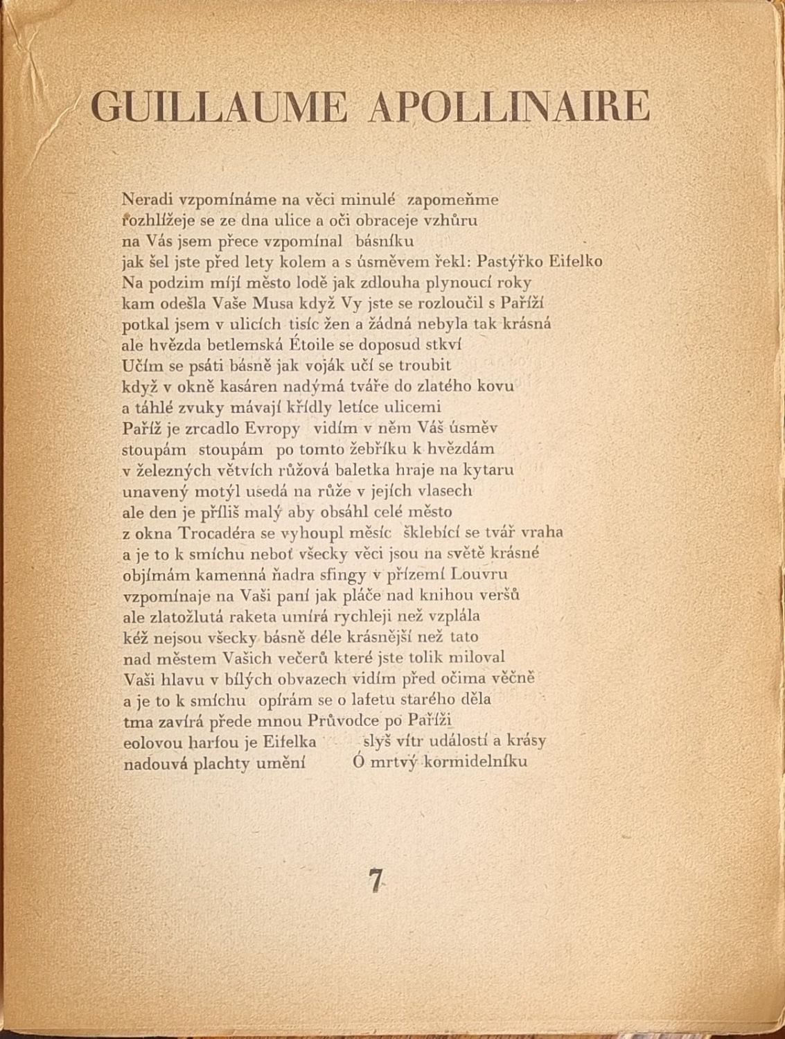 Původní pap. obálka podle návrhu Karla Teigeho, který knihu rovněž typograficky upravil. Na titulním listu prov. přípis perem "Jar. Novák 1925". Obálka mírně zaprášená, na přední straně obálky při vnějším okraji (svisle) lehce pomačkaný papír a v jednom místě lehce natržený, zadní strana obálky při vnějším okraji v jednom místě též lehce natržená, při horním okraji hřbetu v délce cca 2 cm natržený papír.