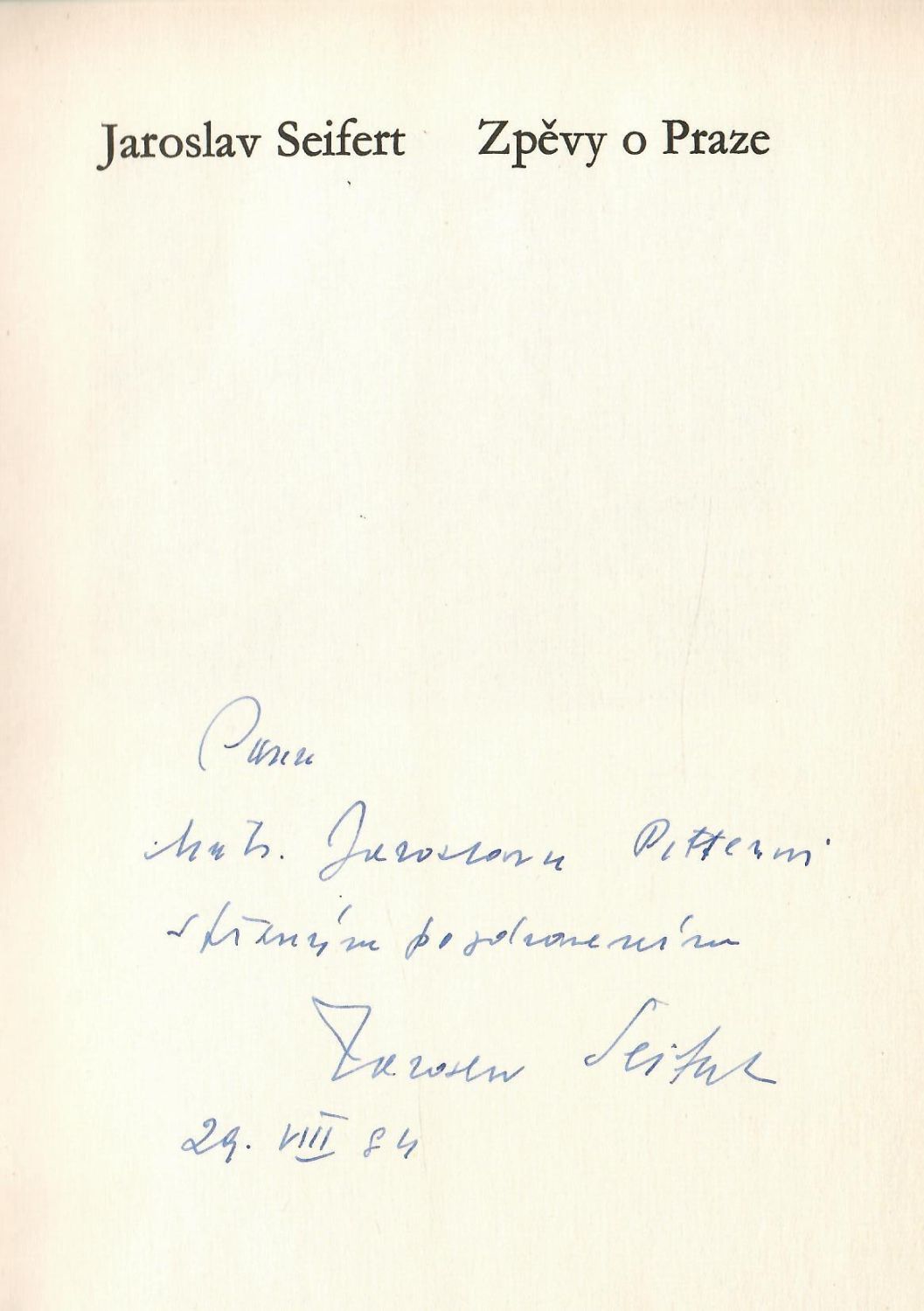 Na patitulu rukopisná dedikace Jaroslava Seiferta. Papírový obal místy natržený, při okrajích pomačkaný. V horní části přední desky částečně odloupnutý plastový pokryv.