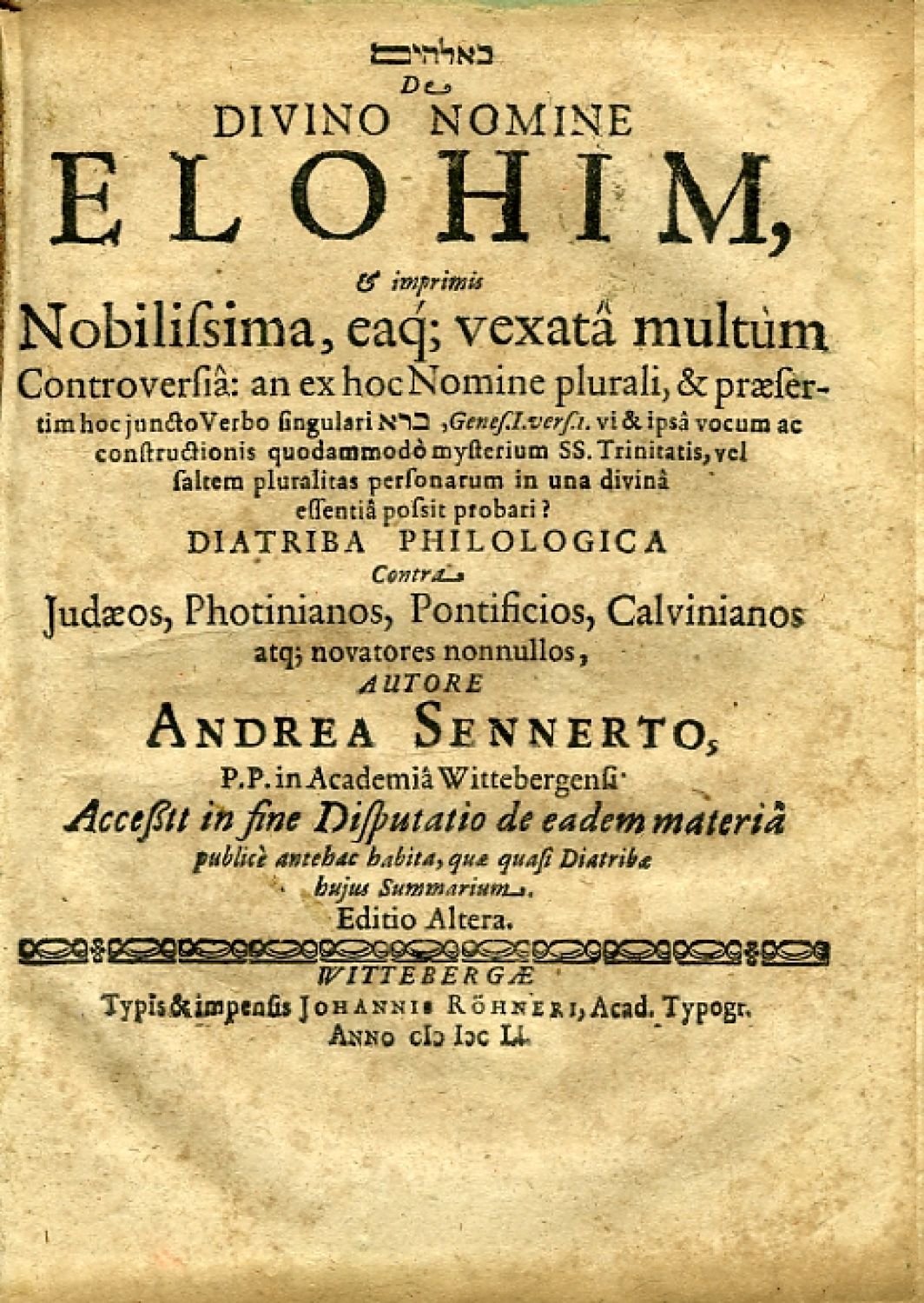 De DIVINO NOMINE ELOHIM, & imprimis Nobilissima, eaq; vexata multum Controversia: an ex hoc Nomine plurali, & praeservetim hoc juncto Verbo singulari .... vocum ac constructionis quodammodo mzsterium SS. Trinitatis, vel faltem pluralis personarum in una divina essentia possit probari< DIATRIBA PHILOLOGICA Contra Judaeos, Photinianos, Pontificios, Calvinianos atq` novatores nonnullos, ...