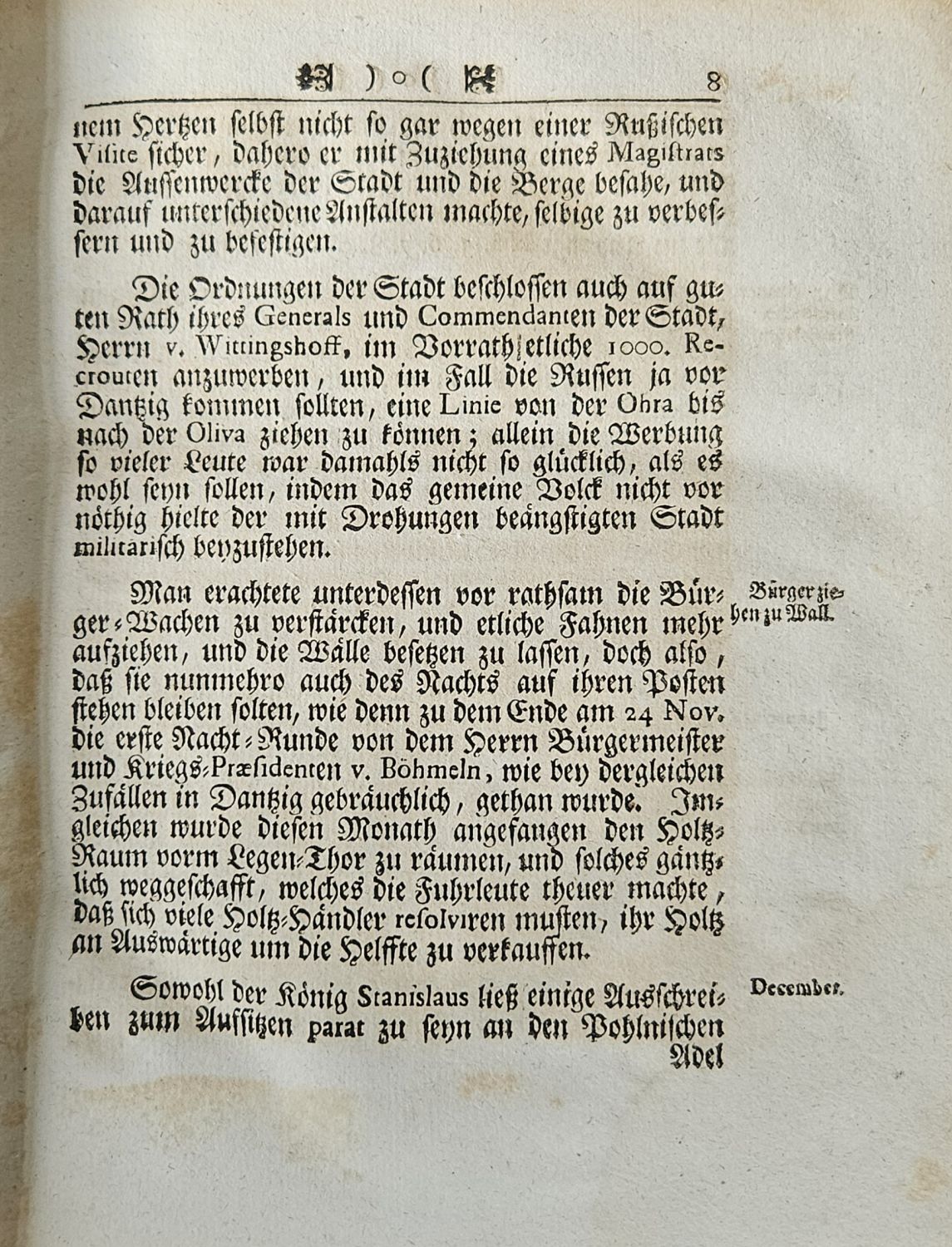 Tištěno švabachem, latinská slova antikvou, uprostřed horního okraje nula v obrácených kulatých závorkách mezi drobnými rostlinnými ozdůbkami od sazby oddělená jednoduchou linkou. Celkem sedm samostatných titulních listů, průběžná paginace, která však na sebe u jednotlivých dílů nenavazuje (viz rozpis stránkování). Plné iniciály propletené úponky zalomené do výše 2-7 řádků, pásové vlysy, viněty, tištěné poznámky po stranách. Druhý titulní list "Anhang Zu der accuraten und aufrichtigen Nachricht Von der Russisch= und Sächsischen Belager= und Bombardirung der Stadt Dantzig", třetí "Alt= und Neue Polnisch=Preussische Chronica .... Zweyter Theil", čtvrtý "Ordentliches Tage=Register Von denen Unternehmungen Derer Russen und Sachsen Bey der Belagerung Der Stadt Dantzig. Von unpartheyischer Feder entworffen", Cöln, Hans Paul Merian, 1737 (navazuje na díl předchozí), pátý "Thornische Begebenheiten, Welche Zu gleicher Zeit DANTZIGER Belagerung, 1733. und 1734. Sich merkwürdigst zugetragen. Von unpartheyischer Feder entworffen", Cöln, Hans Paul Merian, 1737, šestý "Elbingische Geschichte, Welche Zu gleicher Zeit Der DANTZIGER Belagerung 1734. Merkwürdigst sich zugetragen. Von unpartheyischer Feder entworffen", Cöln, Hans Paul Marian, 1737, sedmý "Anhang Des Kurtzen Auszuges Alter und Neuer Pohlnisch=Preussischen Kriegs=Geschichten, von Unpartheyischer Feder gesammlet", Cölln, Hans Paul Merian, 1740.