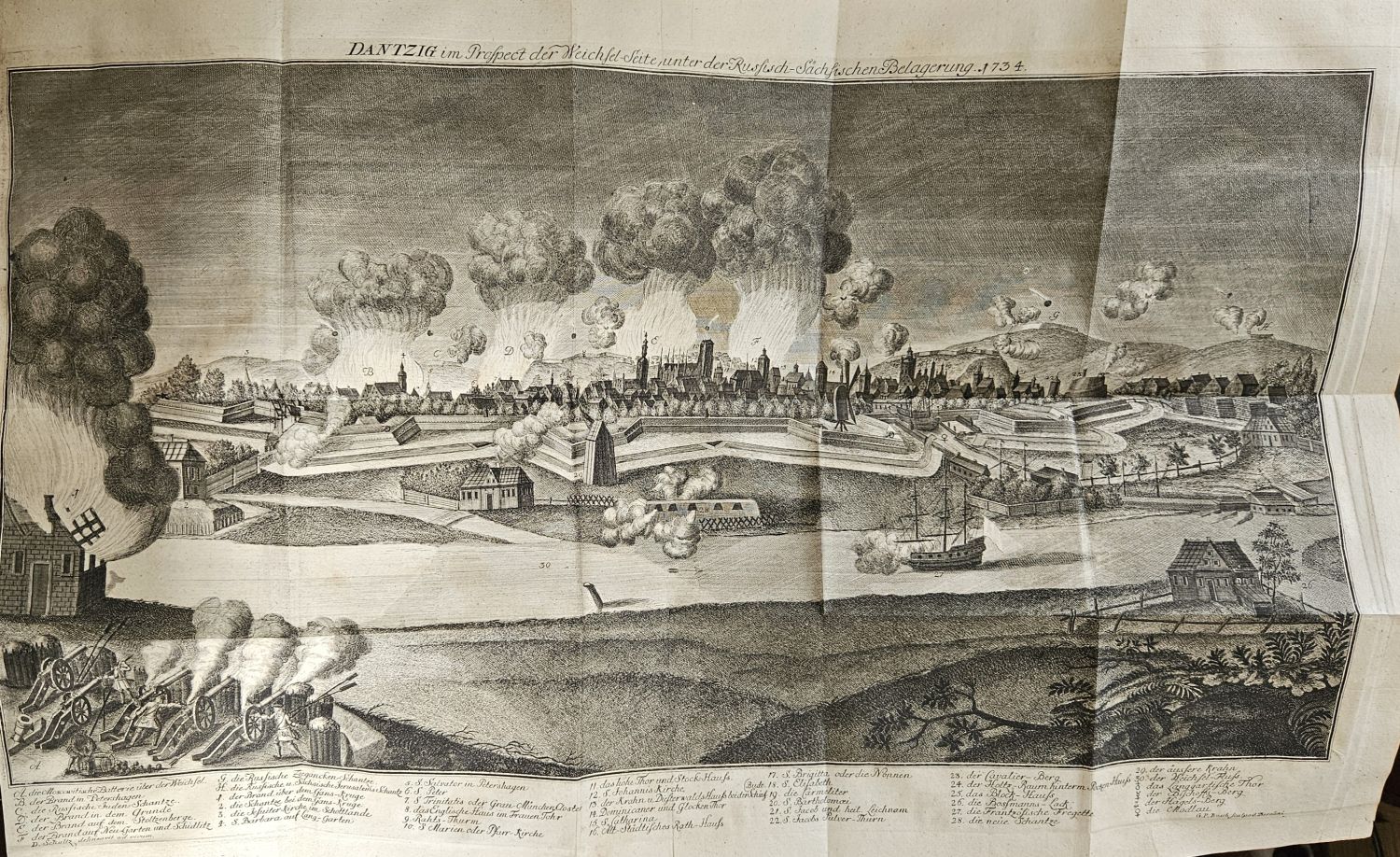 Ve front. mědirytina rytá C. Fritzschem dle D. Schulte, za stranou 142 rozkládací mědirytina (665 x 415 mm) s vyobrazením bombardovaného Gdaňsku signovaná Berolini (rytec) dle G. P. Busche, za str. 196 rozkládací mědirytina (330 x 190 mm) s vyobrazením mincí města Gdańsku, za str. 333 rozkládací rytina (210 x 225 mm) s vyobrazením pevnosti Weichselmünde v Gdaňsku, za str. 406 rozkládací rytina (250 x 215 mm) s vyobrazením kapitána Fischera a leutnanta Ringela, pozicemi ruských baterií a řekou Vislou, za str. 666 rozkládací tabulka s vyjmenovanými divisemi, jejich veliteli,... za str. 671 rozkládací rytina (300 x 380 mm) s vyobrazením města Toruně a jeho opevněním, za str. 744 rozkládací rytina (180 x 200) s vyobrazením osmanských velmožů, za str. 752 rozkládací rytina (225 x 390 mm) s vyobrazením městečka Leibitsch (Lubicz), za str. 788 rozkládací rytina (210 x 340) s plánem města Elbingen.