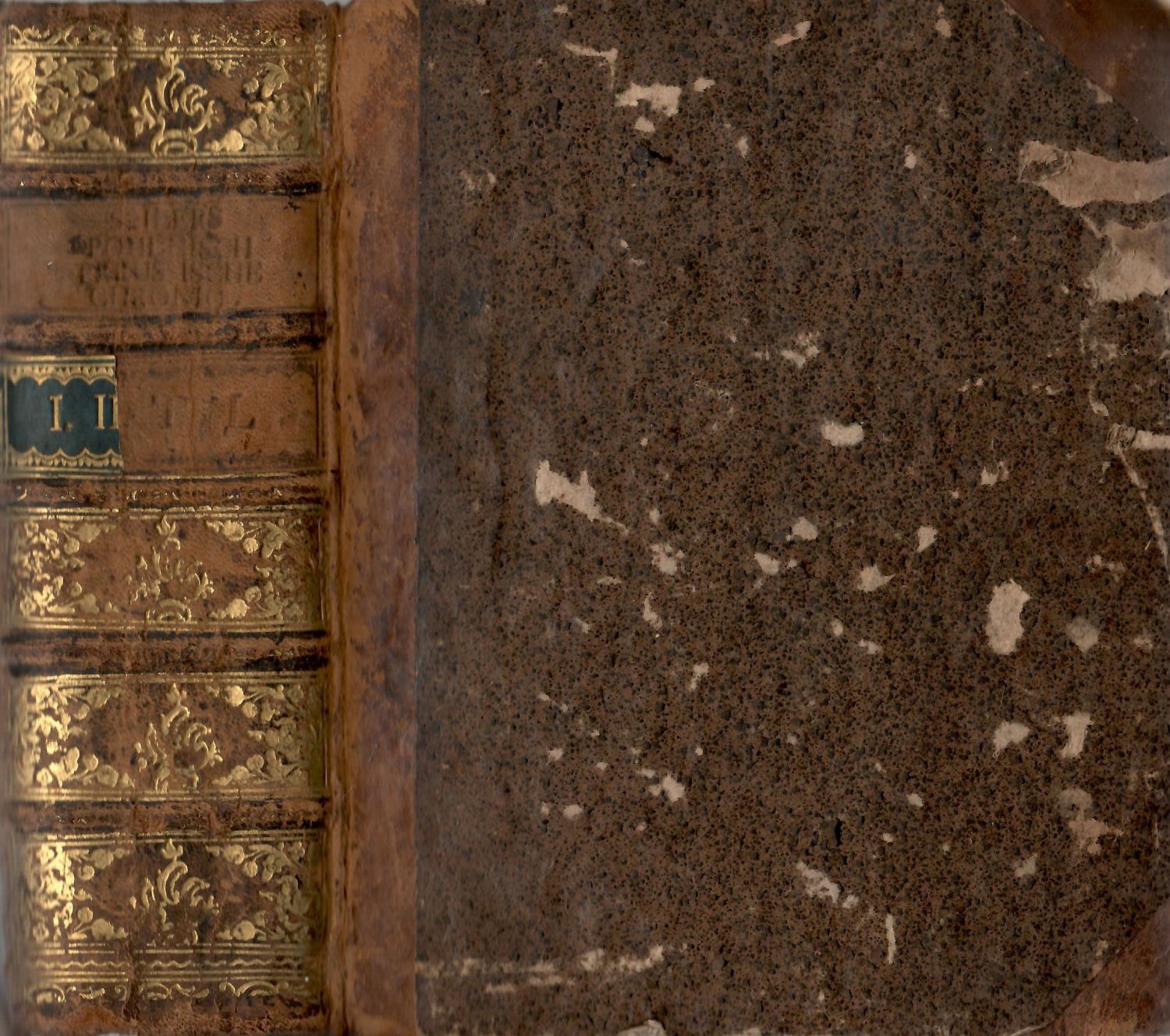 Dobová vazba s kartonovými deskami potaženými mramorovaným papírem, kožený hřbet a nárožnice, črveně barvené ořízky, ve hřbetu 5 vazů, ve druhém poli tlačený název (pravděpodobně se v poli nacházel původně kožený štítek), ve 3 poli torzo koženého štítku s tlačeným a zlaceným značením dílů, v ostatních polích tlačený a zlacený rostlinný ornament. Papírový pokryv místy odřený, kůže ve hřbetu při spodním i horním okraji hřbetu odřená, zlacení částečně vybledlé. Papír místy zahnědlý.