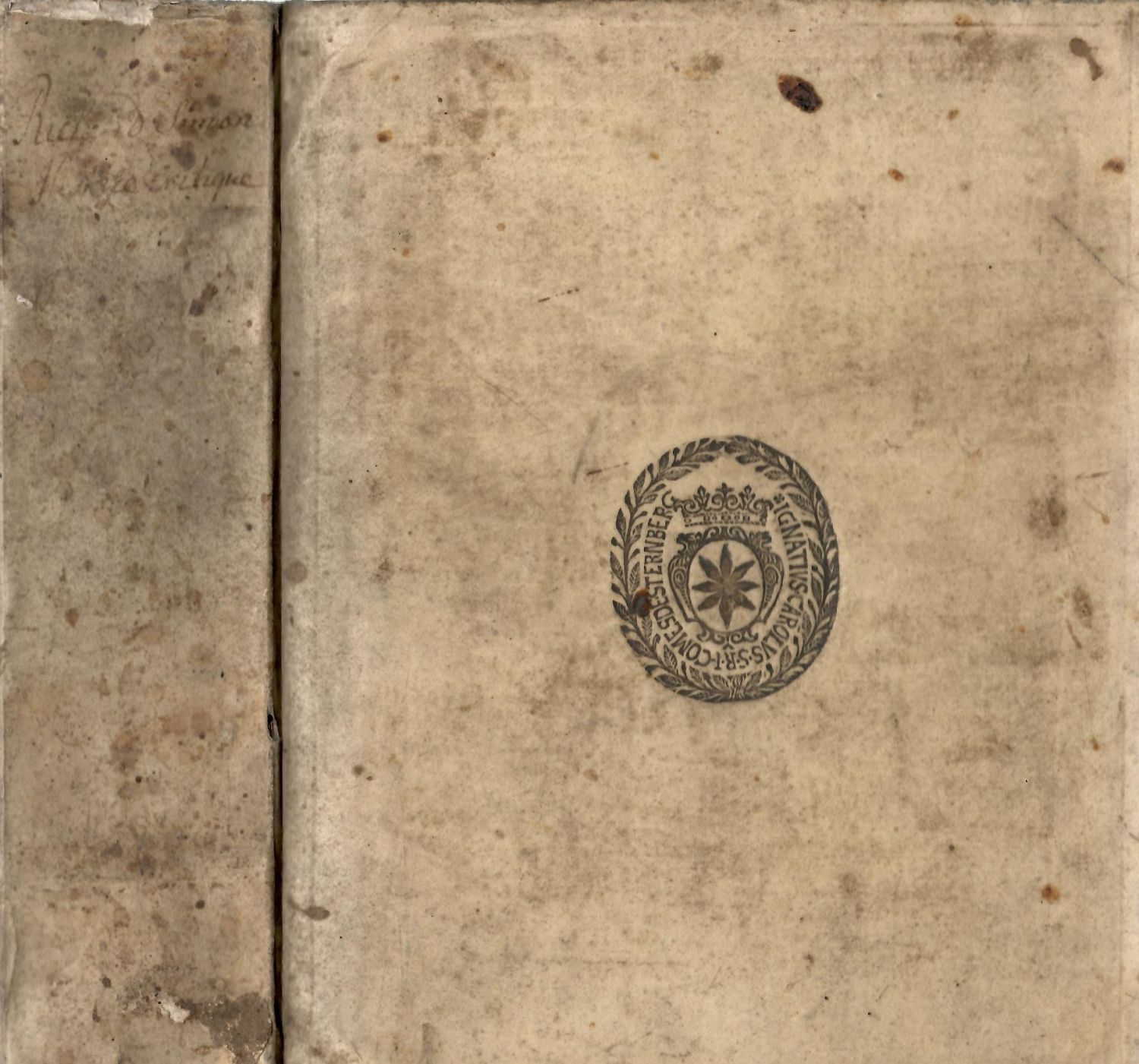Dobová pergamenová vazba, na přední desce dva původní kovové trny, na zadní přezkami přichycené dva původní plechové úchyty, na přední desce i zadní desce tlačené supralibros "Ignatius Carolus Comes de Sternberg", vazba zašpiněná, na zadní desce ve spodní polovině hnědé skvrny. Několik listů proděravělých od červotoče. Na předním přídeští rkp. v záznam perem "Ex Classe Historicorum ...", na tit. listu černým perem dva vlastnické přípisy "Ex Bibliotheca Ignatij Caroli Com. Sternberg" a druhý "Bibliotheca Hibernorum".