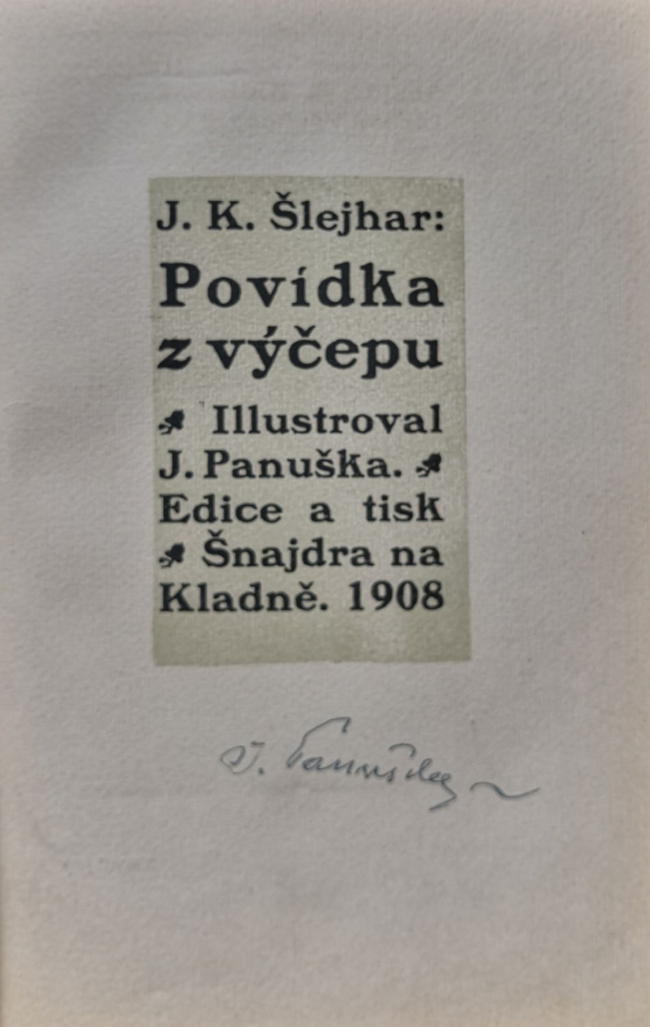 Pěti barevnými ilustracemi vyzdobil Jaroslav Panuška, jeho podpis perem na titulním listu.
