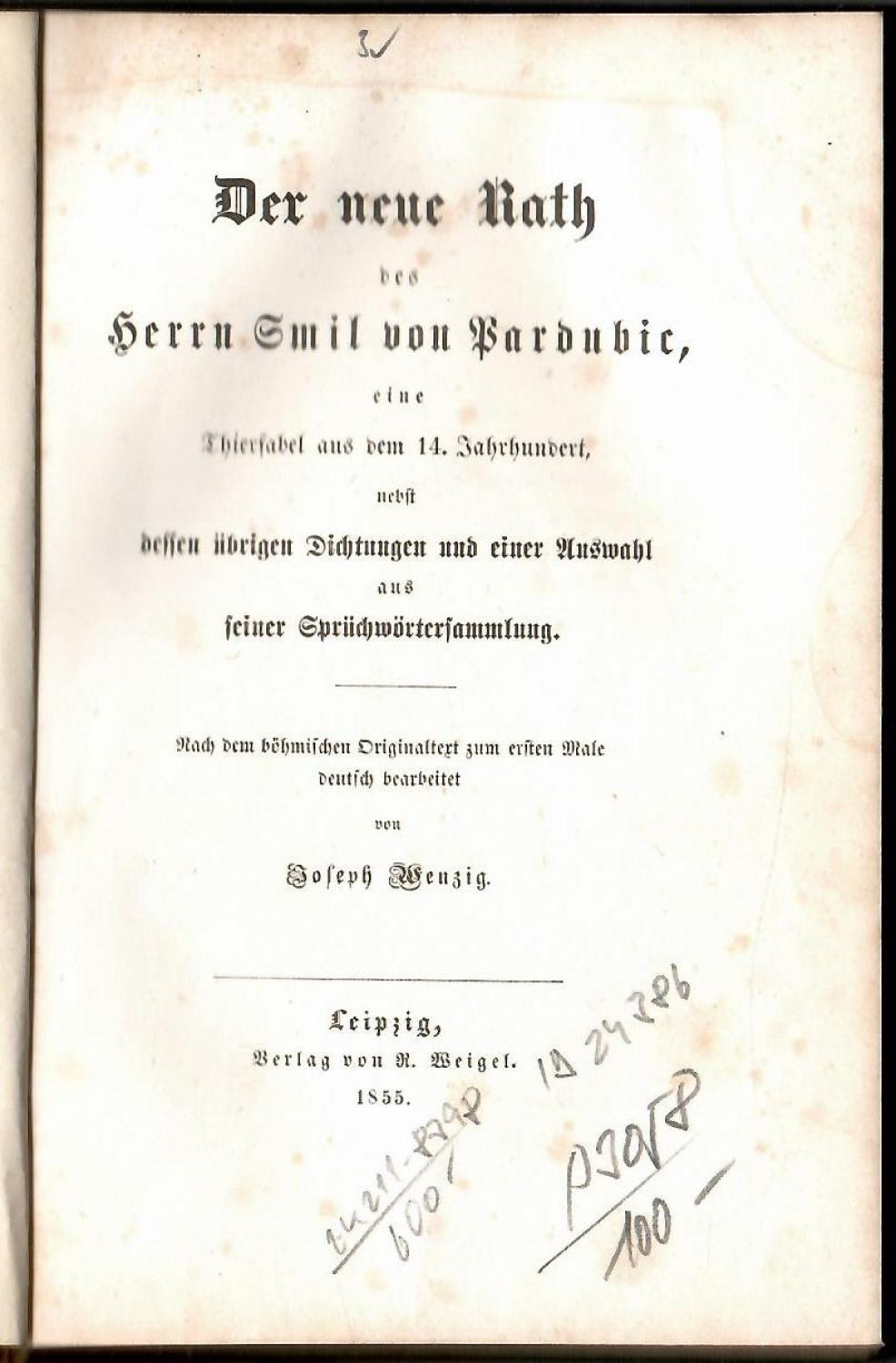Der neue Rath des Herrn Emil von Pardubic eine Thierfabel aus dem 14. Jahrundert, nebst dessen übrigen Dichtungen und einer Auswahl aus seiner Sprüchwörtersammlung.