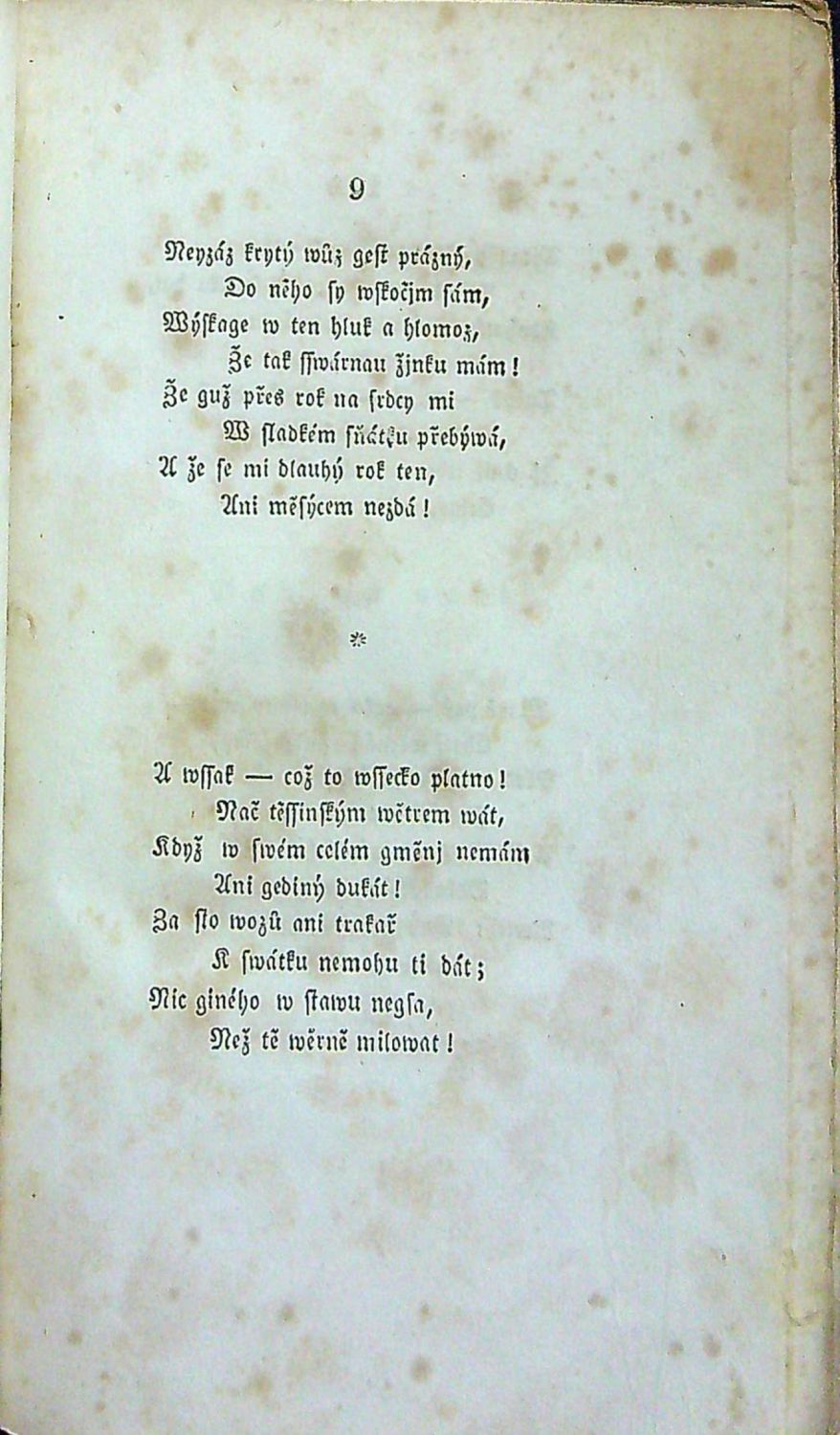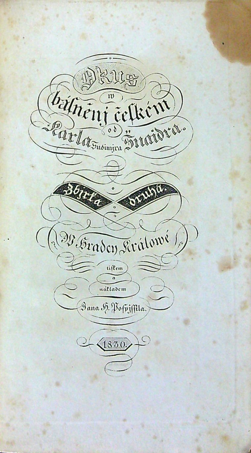 Tištěno švabachem, rytý titulní list, v úvodu básní tučně tištěné versálky, jednoduché tyče, mizící linky. - Úvodní báseň druhého svazku je věnována památce Josefa Dobrovského.
