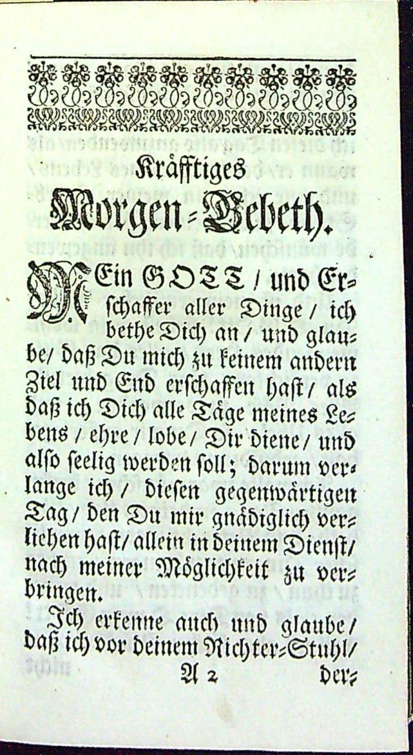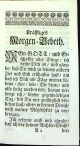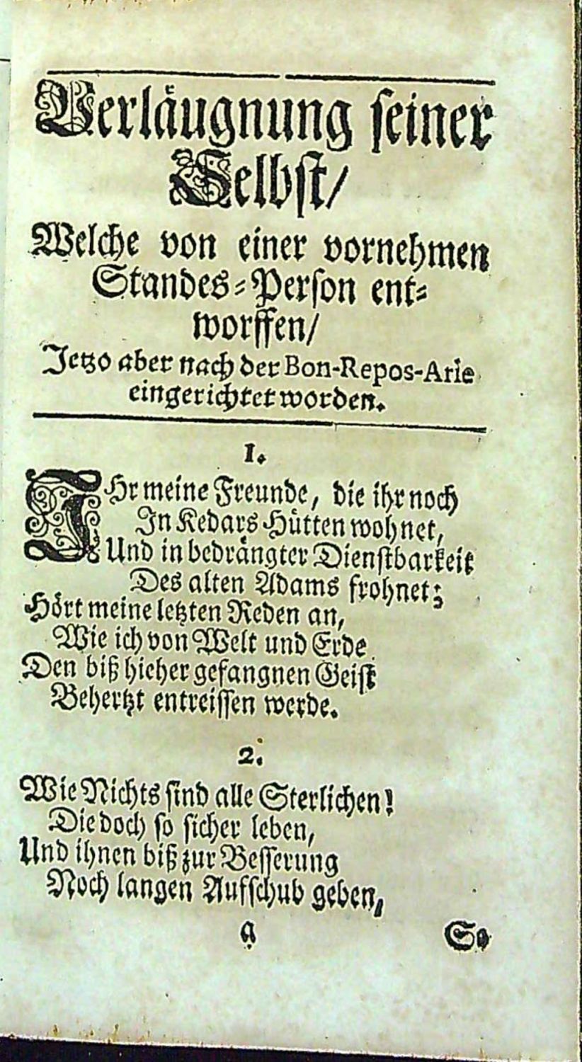 + přívazek: "Verläugnung seiner Selbst/ Welche von einer vernehmen Standes=Person entworffen/ Jetzo aber nach der Bon-Repos-Arie eingerichtet worden". [Prag ?], [Wolfgang Wickhart ?], [cca 1725]. Tištěno švabachem, sazba u horního okraje oddělena jednoduchou linkou, arabsky číslované strofy, názva zvýrazněně tištěny, plné iniciály propletené úponky zalomené do výše 2-3 řádků, koncová viněta. (BCBT neeviduje; SKC eviduje 1 ex. v NK jako přívazek ke stejné knize; KVK eviduje pouze ex. v NK v Praze).