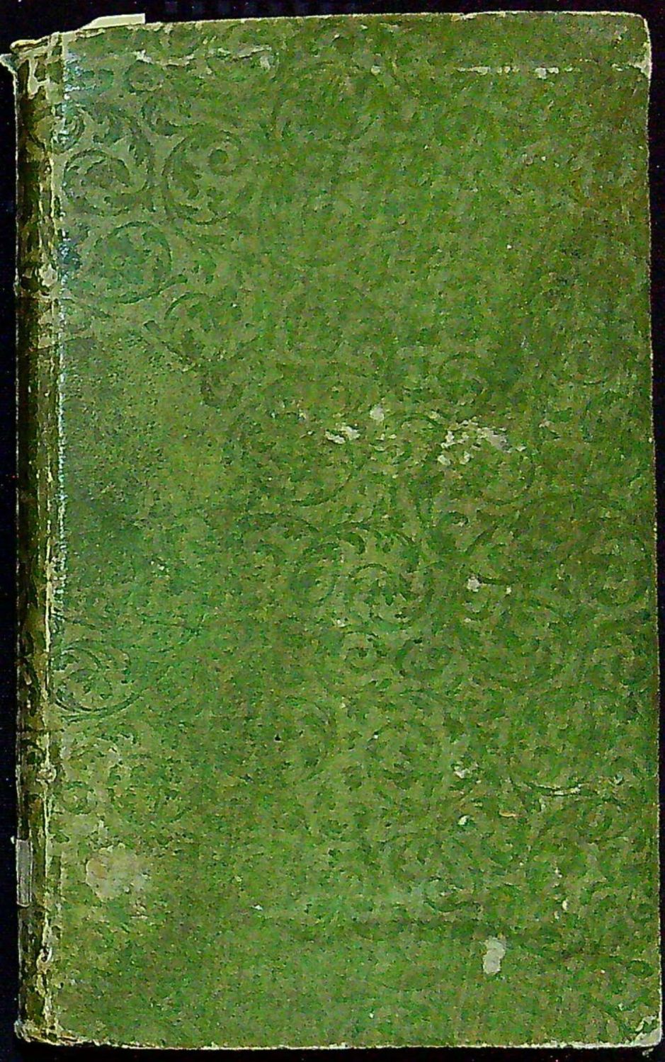 Dobová kartonová vazba potažená světle zeleným brokátovým papírem s tlačeným rostlinným ornamentem. Vazba místy ohmataná, mírně odřená a na zadní desce lehce zkrabatělá. U přívazku chybí pravděpodobně frontispis.