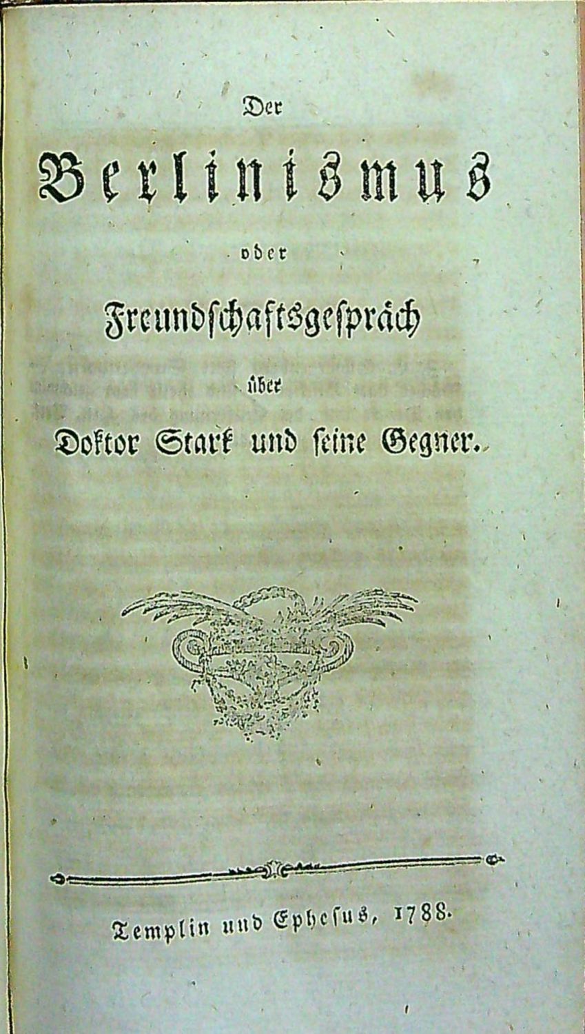 + přívazek: "Der Berlinismus oder Freundschaftsgespräch über Doktor Starck (správně Starck) und seine Gegner". Templin und Ephesus [= Leipzig, Crusius], 1788, 132 stran. Tištěno švabachem, latinská slova antikvou, arabská paginace stran uprostřed horního okraje v hranatých závorkách, na tit. listu viněta, v záhlaví předmluvy a začátku vlastního textu dvě ozdobné lišty. (Wolfstieg 23250).