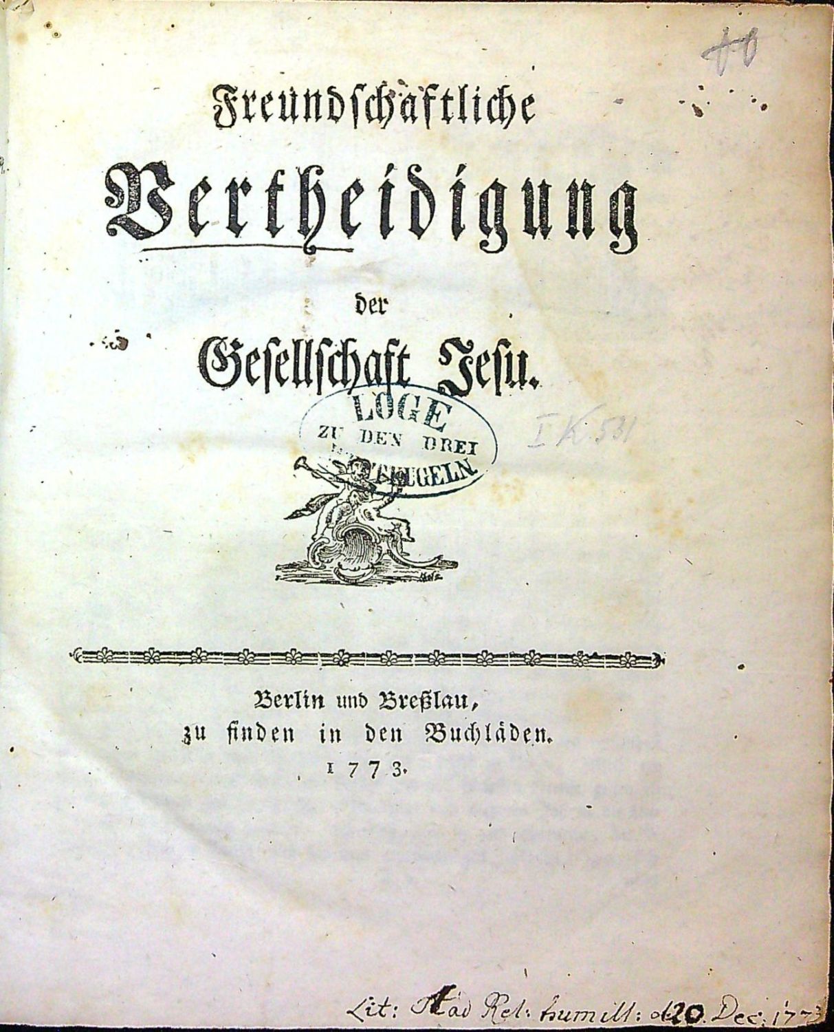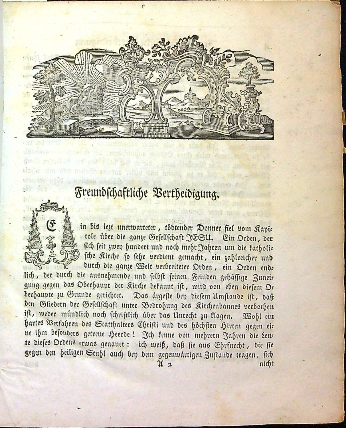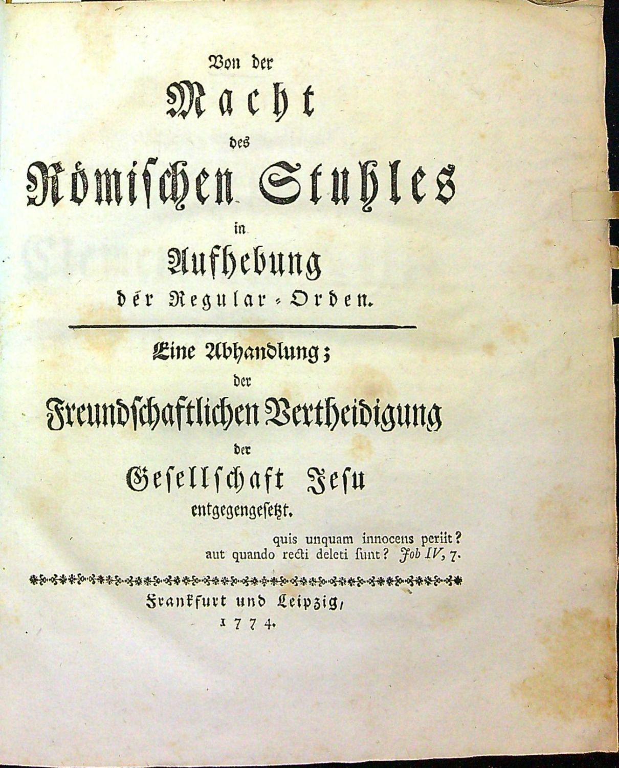 + 1. přívazek: [Heinrich Braun] "Von der Macht des Römischen Stuhles in Aufhebung der Regular-Orden. Eine Abhandlung; der Freundschaftlichen Vertheidigung der Gesellschaft Jesu entgegengesetzt". Frankfurt und Leipzig, bez uvedení vydavatele, 1774, 24 stran, uprostřed horního okraje stran mizící ozdobná tyč, vstupní pásový vlys florálního charakteru.