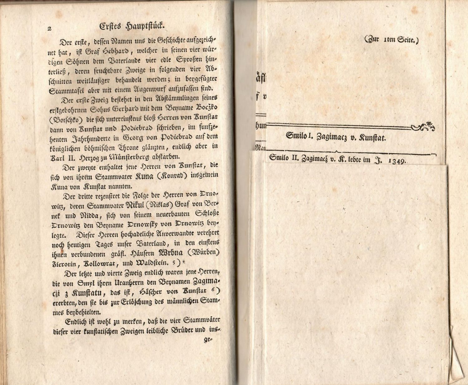 Německý a český text gotikou, latinský antikvou, signatury, stránkové kustody, arabské číslování stran při horním vnějším okraji, živá záhlaví, ozdobné linky, iniciálky ve výši dvou řádků, dřevořezové viněty. Ve front. mědirytina od J. Berky s citátem z Balbínových Miscellaneí, na tit. listě 1. i 2. dílu mědirytinová viněta, na 1. stránce textu 1. dílu mědirytina s vyobrazením Jiřího z Poděbrad, na str. 71 mědirytina s vyobrazením žďárského kláštera, na str. 327 mědirytina s vyobrazením Jana Greifenfelse z Pilsenburgu (od roku 1634 opata zbraslavského kláštera, který roku 1650 zemřel ve žďárském klášteře), za str. 2 prvého dílu rozkládací genealogická tabule s rodokmenem pánů z Kunštátu a Poděbrad, ve druhém dílu 5 celostr. mědirytinových příloh s vyobrazením různých pečetí.