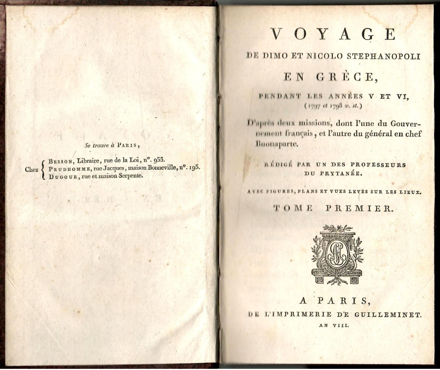 VOYAGE DE DIMO ET NICOLO STEPHANOPOLI EN GRÉCE, PENDANT LES ANNÉES V ET VI, (1797 et 1798 v. st.). D´aprés deux missions, dont l´une du Gouvernement francais, et l´autre du général en chef Buonaparte. RÉDIGÉ PAR UN DES PROFESSEURS DU PRYTANÉE. Tome premier.