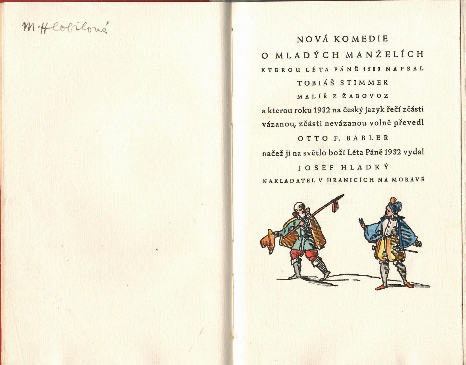 Nová komedie o mladých manželích, kterou napsal léta Páně 1580 Tobiáš Stimmer a kterou roku 1932 na český jazyk řečí zčásti vázanou, zčásti nevázanou volně převedl Otto F. Babler. Tištěno na ručním papíře v úpravě Rudolfa Hály. Č.ex. 155/200. Ručně kolorovala Marie Hlobilová-Mrkvičková.
