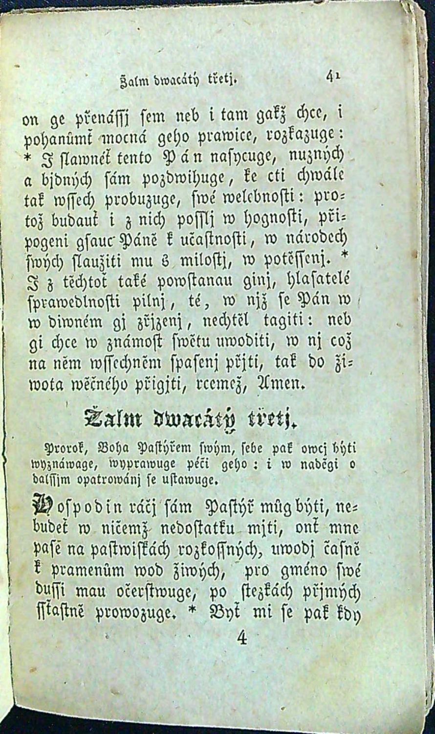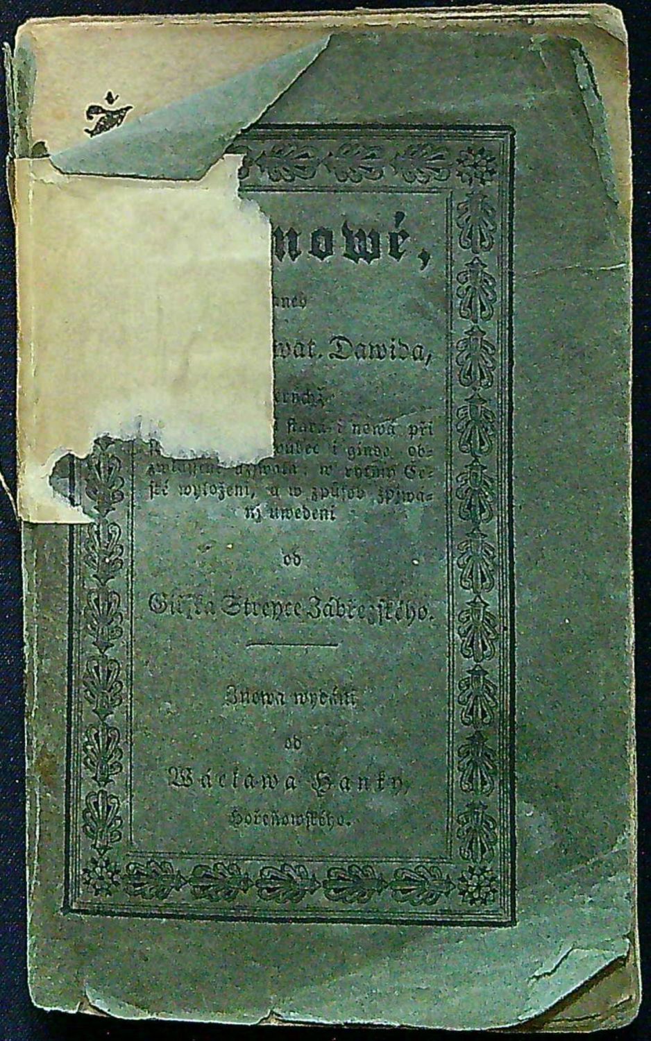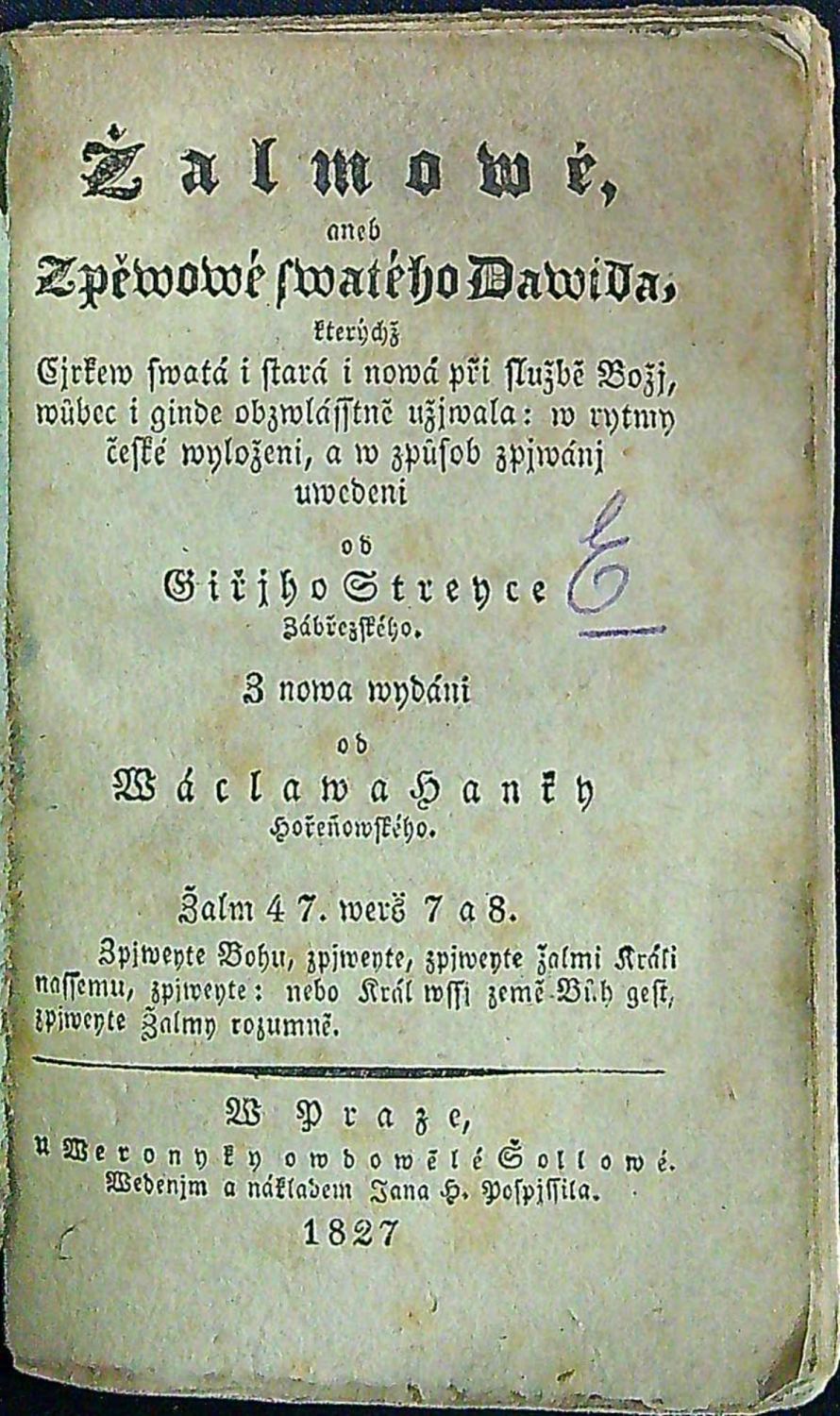Tištěno švabachem, živá záhlaví, tučně tištěné iniciálky a nadpisy jednotlivých žalmů. K vydání připravil Václav Hanka. - Původní pap. obálka, přes hřbet a částečně do obou stran obálky přelepená pap. štítkem, při horním vnitřním okraji přední strany natržená, šitý knižní blok rozpadlý uprostřed na dvě části, knižní blok nerozřezaný.