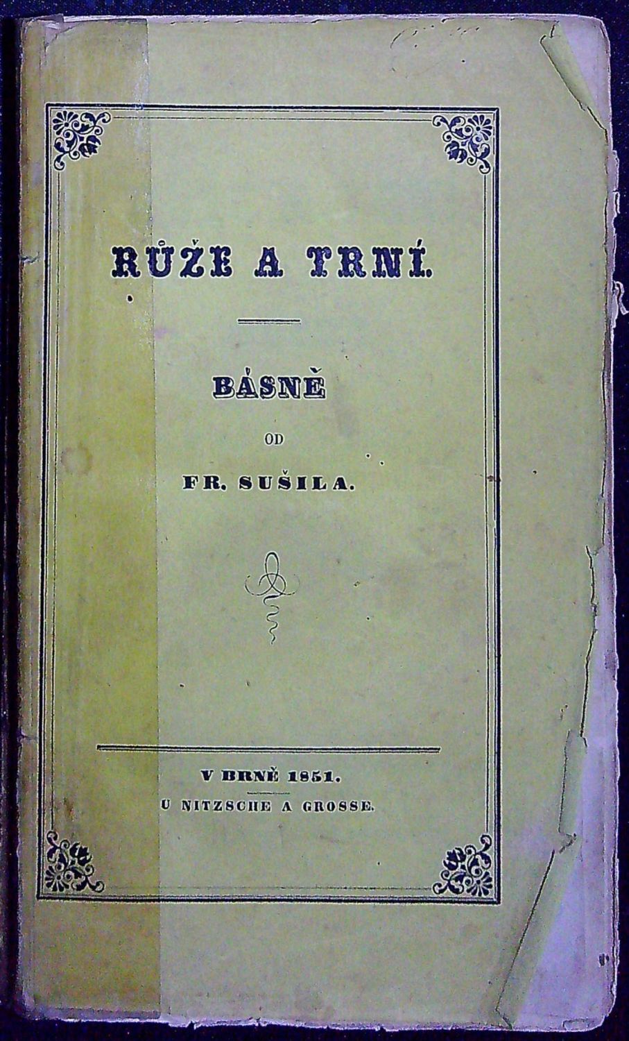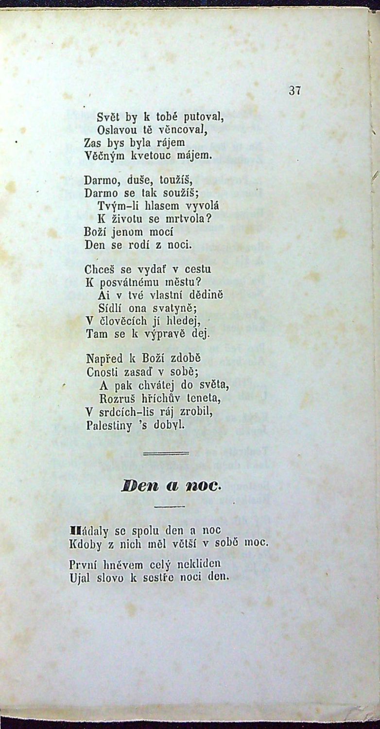 Tištěno antikvou, tučně tištěné názvy jednotlivých básní. - Původní pap. obálka přes hřbet přelepená průsvitnou lepící páskou, přední strana obálky při vnějším okraji potrhaná, oslí uši, knižní blok neoříznutý. Místy drobné hnědé skvrnky.