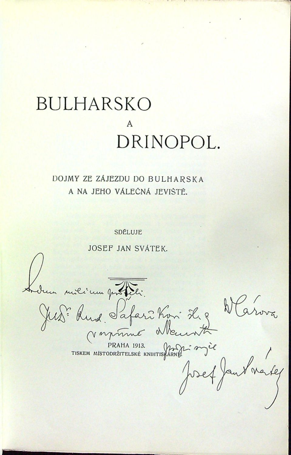 Na tit. listu rkp. dedikace černým perem "Svému milému příteli JUDr. Rud. Šafaříkovi šlechtici z Klárova v upřímné oddanosti Josef Jan Svátek". - Přední strana obálky při spodním okraji přeložená.