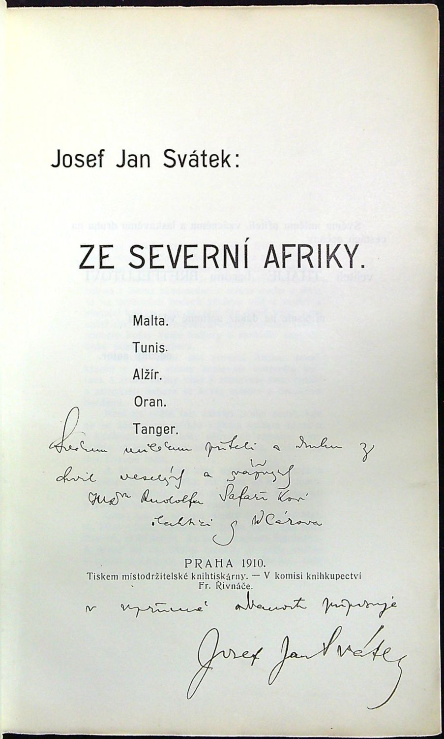 Na tit. listu rkp. dedikace černým perem "Svému milému příteli a druhu z chvil veselých a vážných JUDr. Rudolfu Šafaříkovi šlechtici z Klárova v upřímné oddanosti připisuje Josef Jan Svátek". - Obálka ve spodním okraji lehce zkrabatělá a ve hřbetu odlepená od knižního bloku.