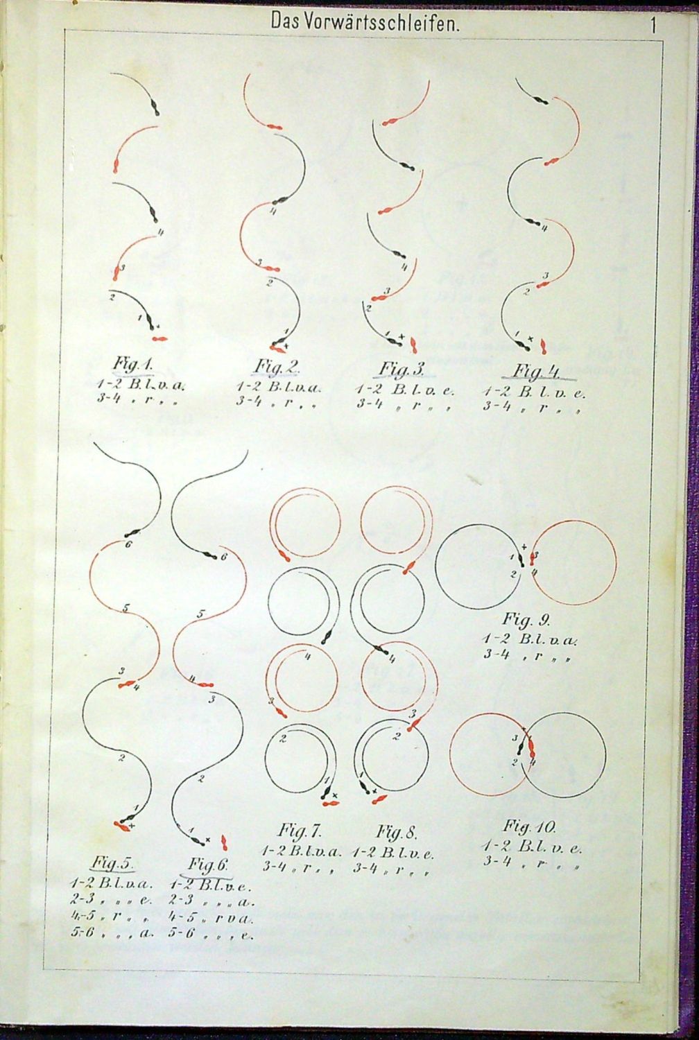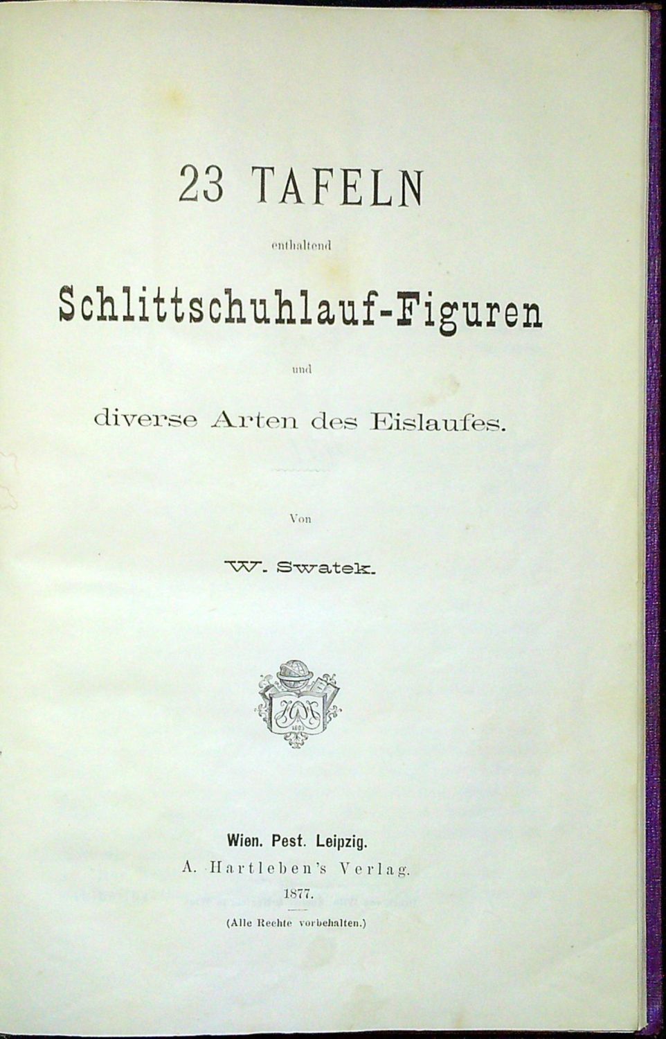 Tištěno antikvou, v textu několik drobných ilustrací, za textem 23 tabulí trojbarevně tištěných se 143 krasobruslařskými figurami a různými druhy bruslení. - Dobová plátěná "lipská vazba" s lisovaným zrcadlem na obou deskách, na přední desce při horním vnitřním okraji nalepen starý pap. štítek s číslem. Na přední předádce podpis Jiřího Šalamouna tužkou.