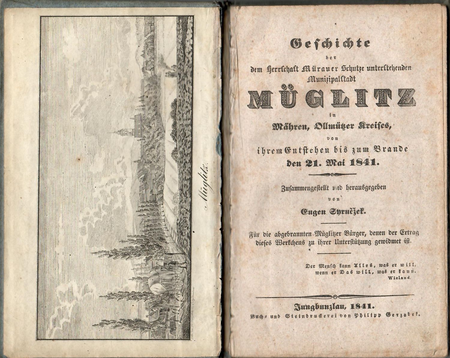 Geschichte der dem Herrschaft Mürauer Schutze unterstehenden Munizipalstadt MÜGLITZ in Mähren, Ollmützer Kreises, von ihrem Entstehen bis zum Brande den 21. Mai 1841.