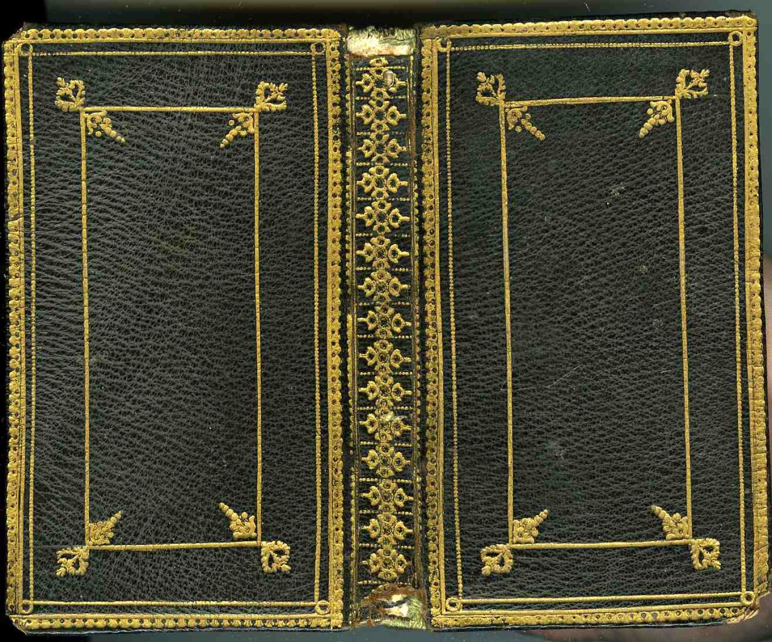 Černá vazba se zlac. rámovou komposicí na deskách, zlac. hřbetem a ořízkou, tragantové předsádkové papíry. Rohy naražené, cca 0.5 cm pokryvu na koncích hřbetu chybí, na předních listech hnědé skvrnky. Proti tit. listu a na něm staré rkp. provenienční poznámky. - Backer/Sommervogel VII, sl. 1859, č. 4