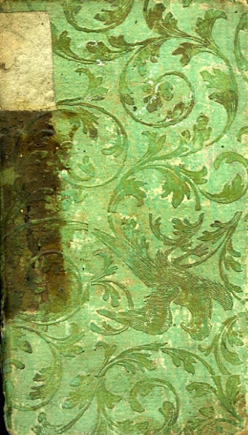 Desky potažené zeleným papírem s původně zlaceným florálně-figurálním dekorem, hřbet popraskaný, na jeho okrajích pokryv chybí, v horní části torso pap. štítku, ve střední hnědá stopa po jiném, přední předsádka chybí, listy průběžně zahnědlé. - M. Tanner (1630 Plzeň - 1692 Praha), rektor pražské jesuitské koleje, šest let hlava české řádové provincie.