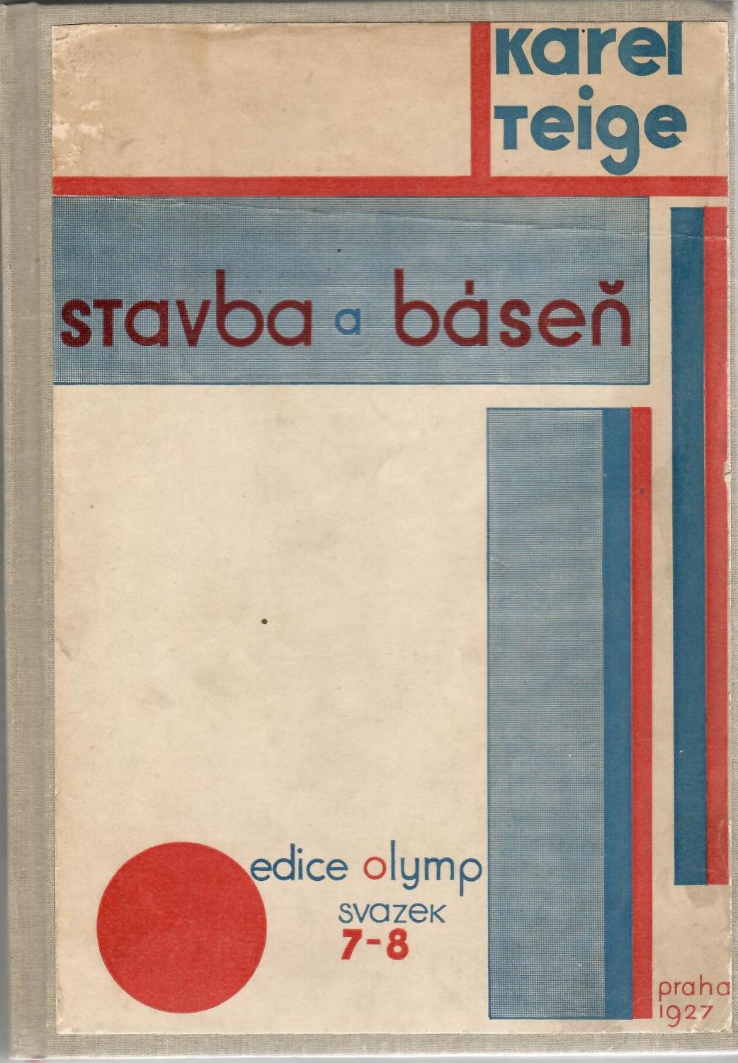 Obálku navrhl a typograficky upravil Karel Teige. Za textem 16 listů příloh s fotografickými vyobrazeními architektury a výtvarných prací různých světových autorů. - Papír při horním vnějším okraji lehce pomačkaný.