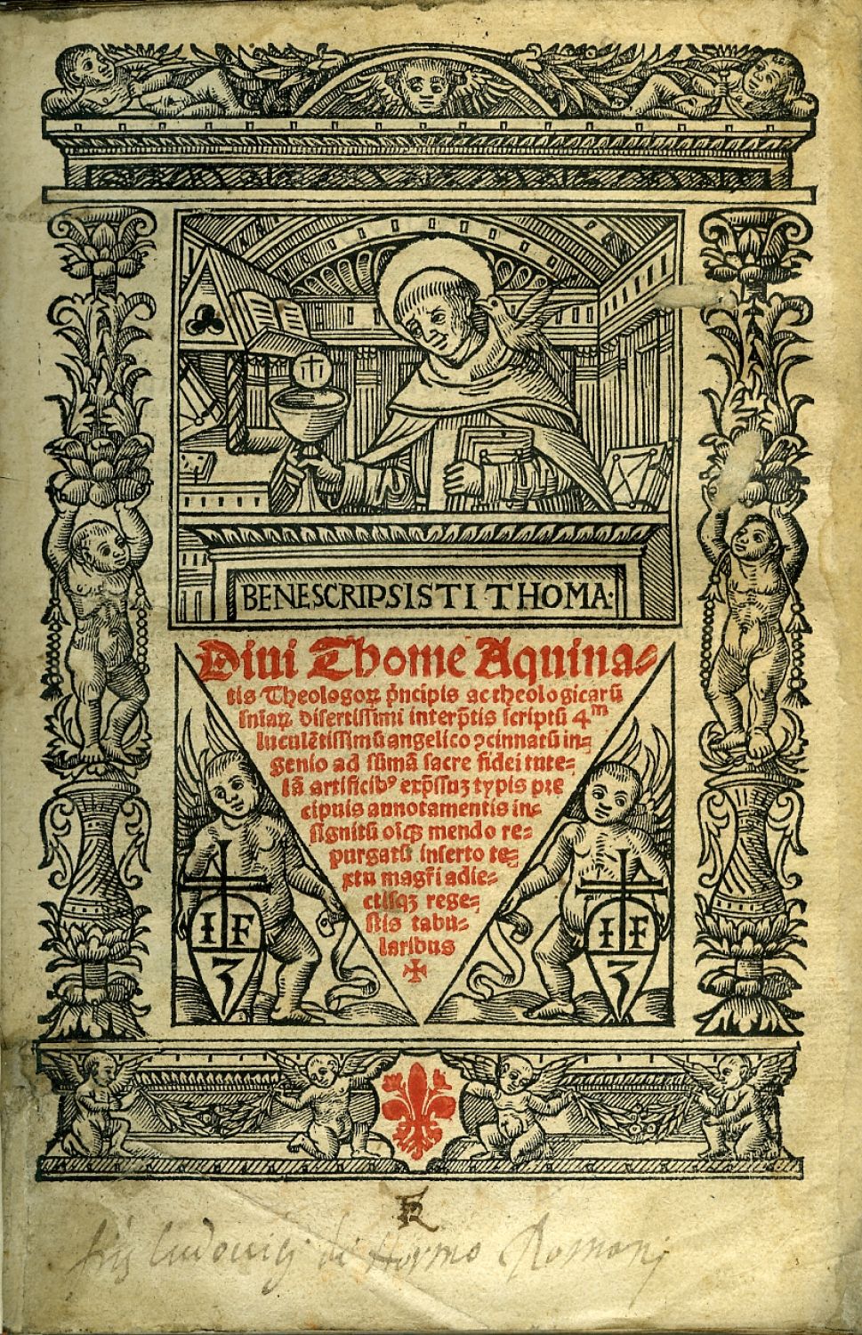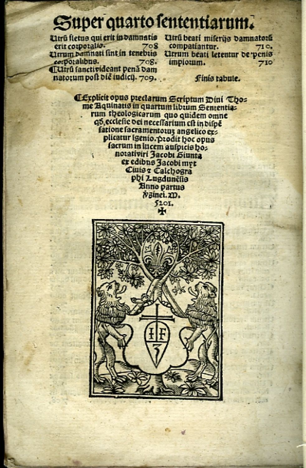 Diui Thome Aquina|tis ... scriptu[m] 4m lucule[n]tissimu[m] angelico [con]cinnatu[m] in|genio ad sum[m]a[m] sacre fidei tutela[m] artificib[us] exp[re]ssu[m] typis pre|cipuis annotamentis in|signitu[m] o[mn]ique mendo re|purgatu[m] inserto te|xtu magri adie|ctisq[ue] rege|stis tabu|laribus. [Kolophon: ... Prodit hoc opus sacrum in lucem auspicis ho|norati viri Iacobi Giunta ex edibus Iacobi myt Ciuis & Calcogra|phi Lugdune[n]sis Anno partus Avginei. M. 5201. /= 1520/].