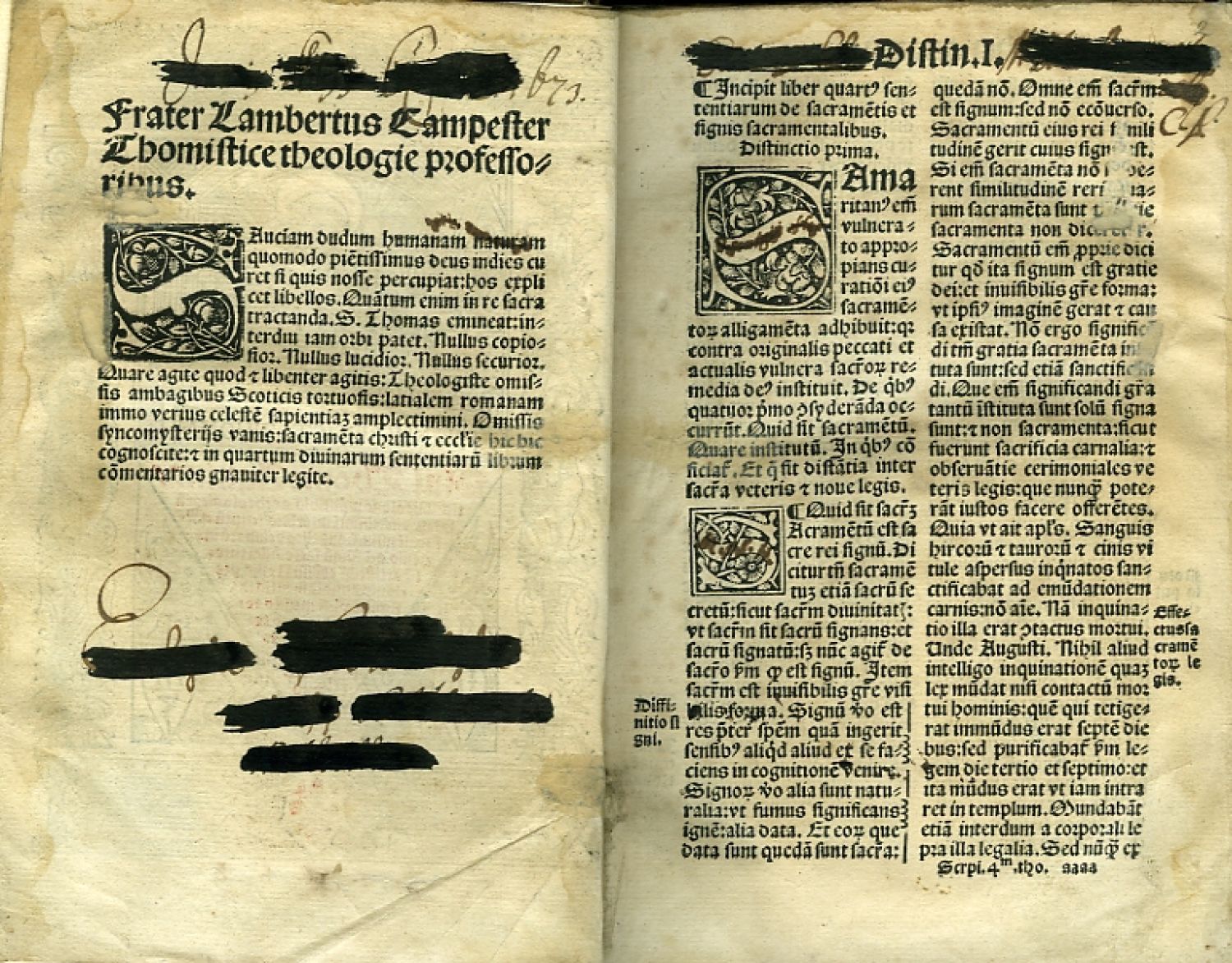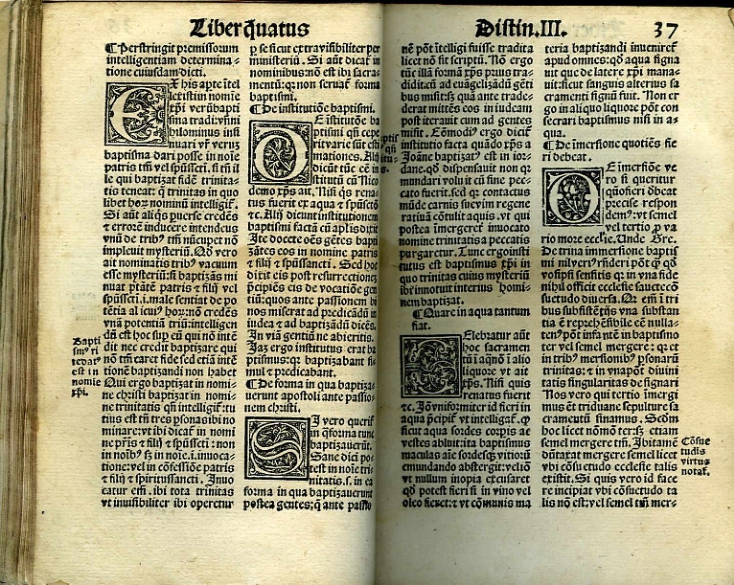 Poslední ze čtyř "scriptum sententiarum" Tomáše Akvinského (1225-1274), jež vyšly u Giunty týž rok ve stejné úpravě. - Latinský text tištěný antikvou ve dvou sloupcích. - Nová světlá kožená vazba, na hřbetě starý kožený štítek s nečitelným rkp. věcným názvem, dva páry nových zelených vázacích tkanic, nové předsádkové papíry. Na spodním, mírně pomačkaném okraji tit. listu starý provenienční přípis, na jeho rubu a násl. fol. 2a staré poznámky začerněné inkoustem. Dva listy vpředu a fol. 104 odborně podlepené, místy hnědé mapy od vlhkosti.
