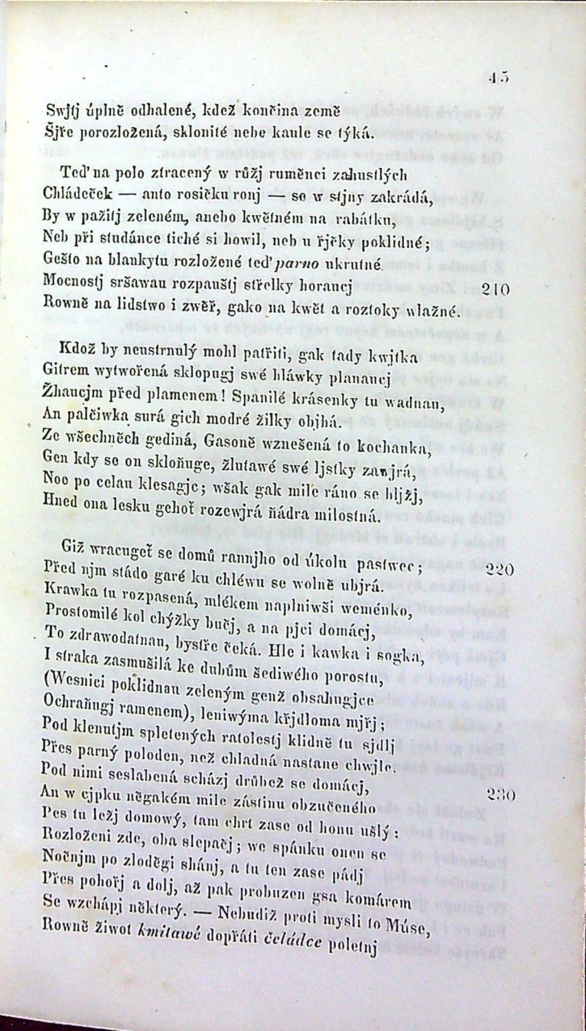 Tištěno antikvou. - Dobová vazba z temně zeleného plátna, na obou deskách tlačený ozdobný rám, ve hřbetu, mezi tlačenými a zlacenými ozdůbkami, název, stříkané ořízky. - Chybí front. s portrétem autora.