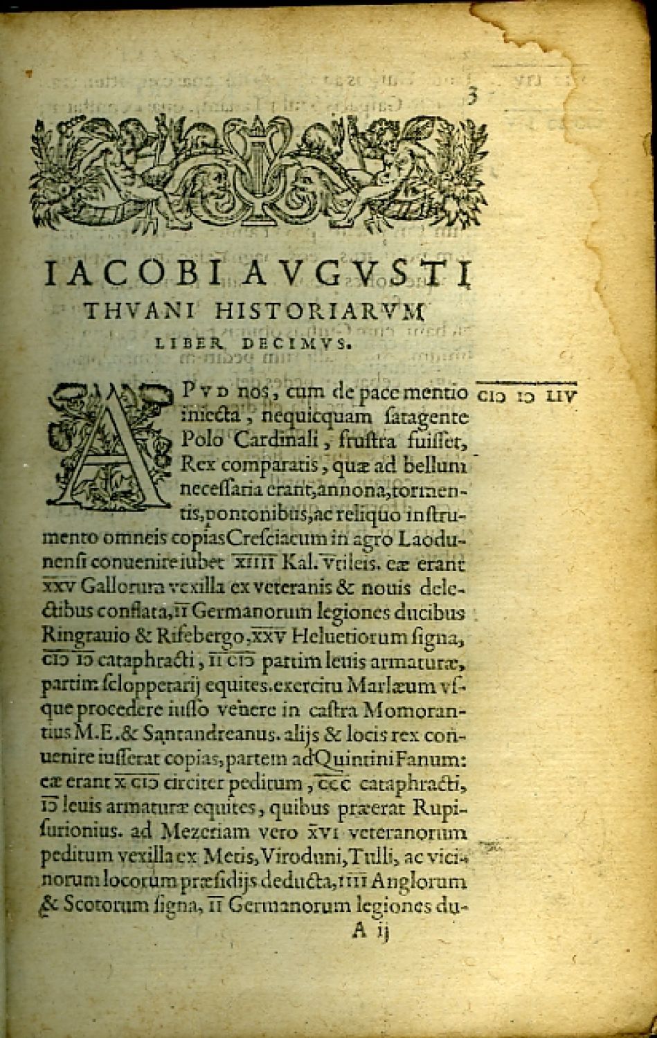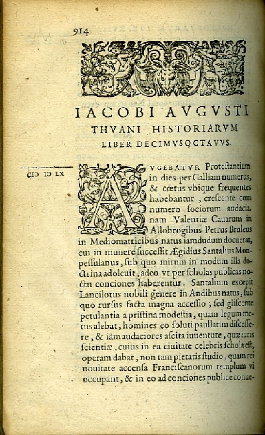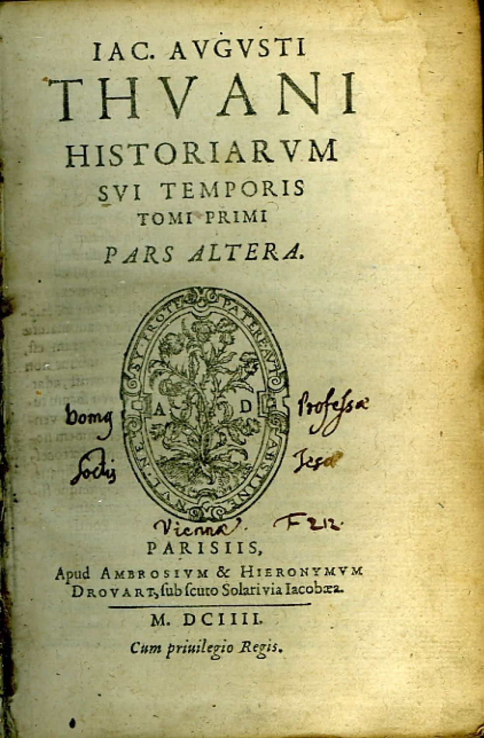 Jacques-Auguste de Thou (8.10.1553 Paříž - 7.5.1617 Paříž), francouzský státník, historik a sběratel. Pro své nestranné postoje k dobovým událostem a kritickou prací s dobovými prameny patří mezi průkopníky ve vědeckém přístupu k historii. Roku 1595 se stal předsedou francouzského parlamentu a hlavně jeho zásluhou byl roku 1598 přijat Nantský edikt mezi katolíky a hugenoty. Přivodil si tím nepřátelství ze strany církevní hierarchie, které se zvýšilo po vydání jeho historie v roce 1604. Ve svém díle nestranně popisuje dobové události, první díl končí rokem 1560, druhý zachycuje období mezi lety 1560-1572 (zabývá se náboženskými válkami a zvláštní pozornost věnuje masakru Bartolomějské noci), třetí díl popisuje události z let 1572-1574 a čtvrtý 1574-1584. Dílo vyvolalo mohutný odpor v církevních kruzích a 2. až 4. díl byly zařazeny do soupisu církví zakázaných knih. - Na trhu se toto vydání objevuje jen vzácně a vlastní jej pouze několik málo knihoven z celého světa. Fond NK ČR obsahuje prvou část prvého dílu, díl druhý a třetí.