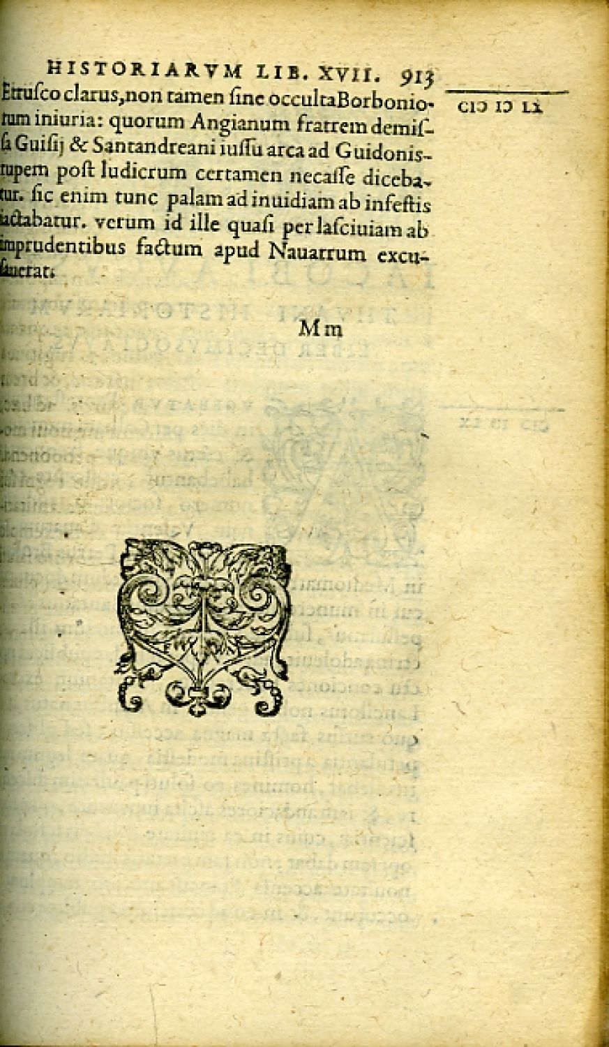 Na titulním listu signet tiskařův, živá záhlaví tištěná versálkami, po stranách při horním okraji pod krátkou linkou datace obsahu jednotlivých knih (kniha obsahuje část 10. - 18.), v záhlaví jednotlivých knih pásové vlysy s postavami andílků a různými ornamenty, v úvodu textu konturové iniciály na rostlinném a ornamentálním pozadí zalomené do výše 6-9 řádků, na konci 17. knihy viněta. - Dobová pergamenová vazba, ve hřbetu 4 vazy, barvené ořízky, v prvním poli hřbetu inkoustem psaný název, ve druhém a pátém poli stará knih. čísla. Vazba zašpiněné a mírně odřená, desky lehce pokroucené, předsádky zašpiněné, na prvních 3O stranách při vnějším okraji nahnědlé mapky od vlhkosti. Na tit. listu provenienční vídeňský přípis perem. Nabízená kniha je druhou částí prvého svazku 2. vydání (prvního vydaného ve formátu 8°). První vydání vyšlo téhož roku ve dvou foliovývh svazcích v Paříži u Mamerta Patissona a Roberta Estienna. První část druhého vydání vyšla r. 1604, další díl 1606 a poslední 1607 u Ambrosia a Hieronyma Drouarta.