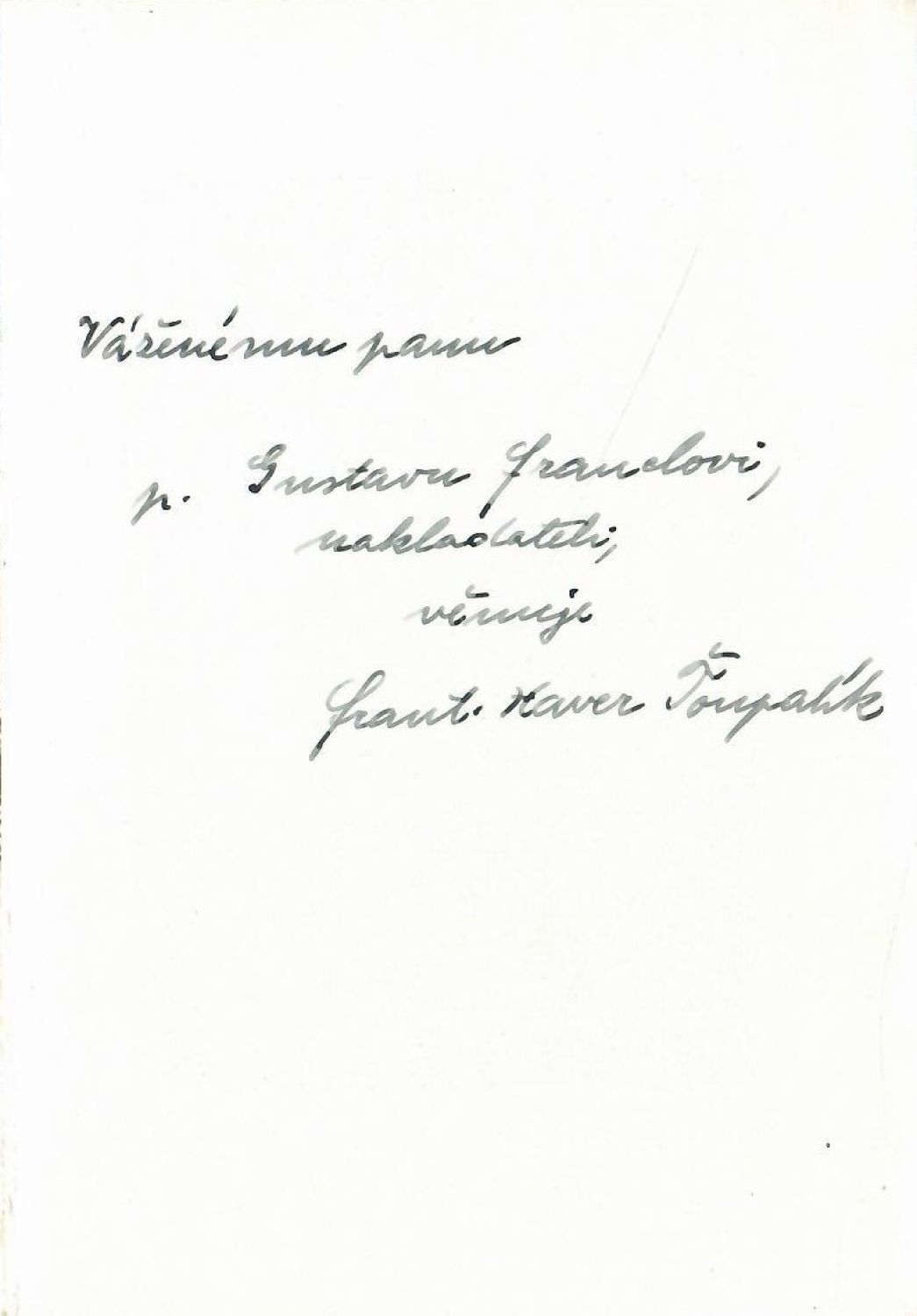 Tištěno na ručním papíře. - První složka listů s frontispisem odlepená, jinak dobrý stav. Na rubu frontispisu rkp. dedikace autora nakladateli Gustavu Franclovi.