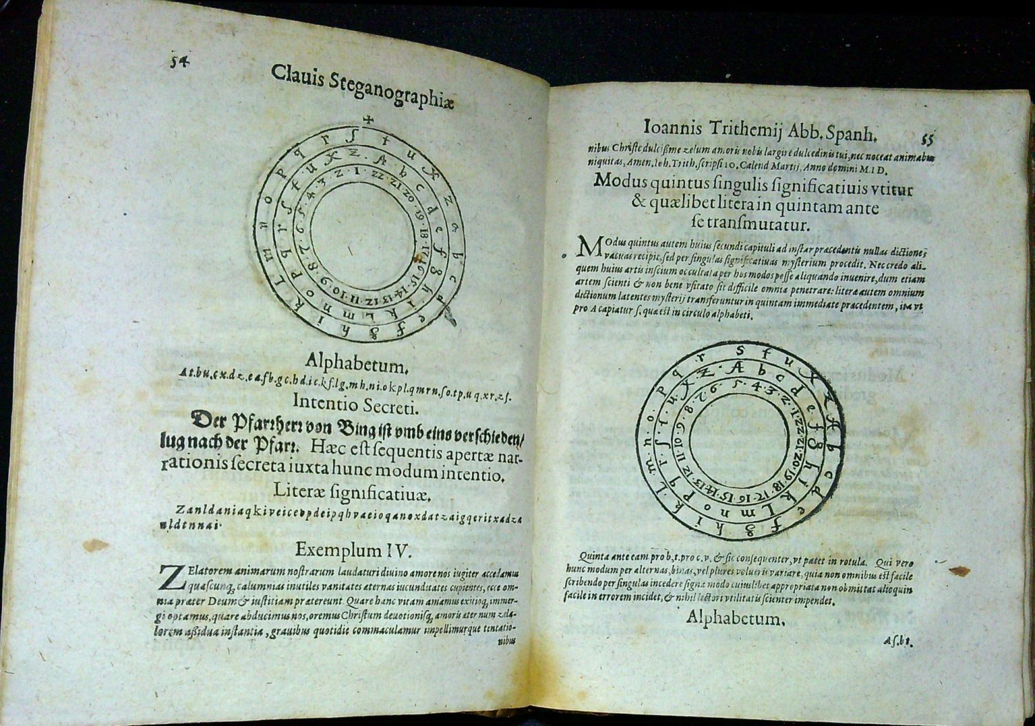 Latinský text antikvou a kurzivou, německý gotikou, signatury, stránkové kustody, konturové iniciály ve dvojitém jednoduchém rámečku na rostlinném pozadí zalomené do výše 4-7 řádků, tučně tištěné versálky ve výši 2 řádků, pásové dřevořezové vlysy s andílky zakomponovanými do rostlinného ornamentu, na titulních listech viněty, živá záhlaví. V textu několik příkladů kryptografů a kryptogramů. Za stranou 64 první části titulní list "Clauis generalis Triplex IN LIBROS STEGANOGRAPHICOS IOHANNIS TRITHEMII ABBATIS SPANHEIMENSIS. AB IPSO AVTORE CONSCRIPTA, ET AMATORIBVS HVIVS artis gratitudinem declaraturis et secreto retinentibus communicanda", Darmstadt, Excudebat Balthasar Hofmann, impensi Johann Berner, 1621. Za stranou 7 druhé části titulní list "STEGANOGRAPHIA Hoc est: ARS PER OCCVLTAM SCRIPTVRAM ANIMI SVI VOLVNTATEM ABSENTIBVS aperiendi certa; AVTORE REVERENDISSIMO ET CLARISSIMO VIRO, Ioanne Trithemio, Abbate Spanheimensi, et Magia Naturalis Magistro perfectissimo. PRAEFIXA EST HVIC OPERI SVA CLAVIS, SEV vera introductio ab ipso Authore concinnata; HACTENVS QVIDEM A MVLTIS MVLTVM DEsiderata, sed a paucissimis visa: Nunc vero in gratiam secretioris Philosophiae Studiosorum publici iuris facta. Cum Privilegio et consensu Superiorum". Darmstadt, Ex Officina Typographica Balthasar Aulaeandr, Suptibus vero Johann Berner, 1621. Třetí část knihy se skládá ze tří částí.