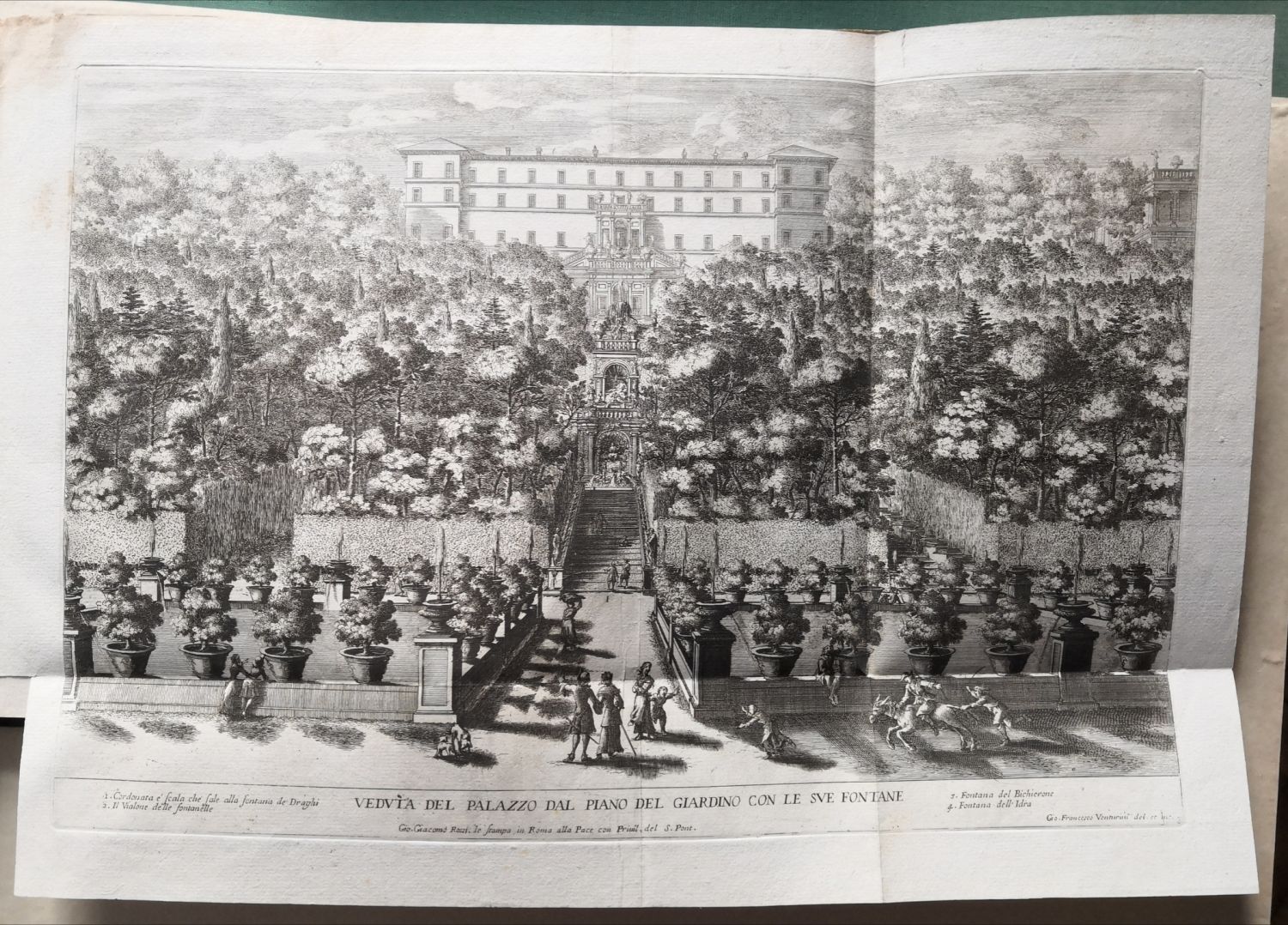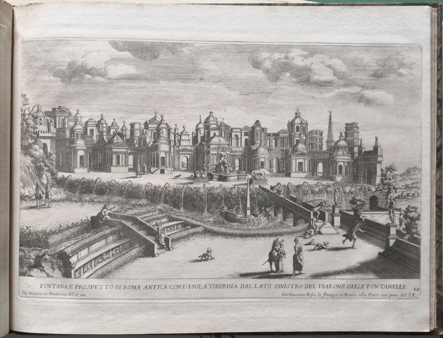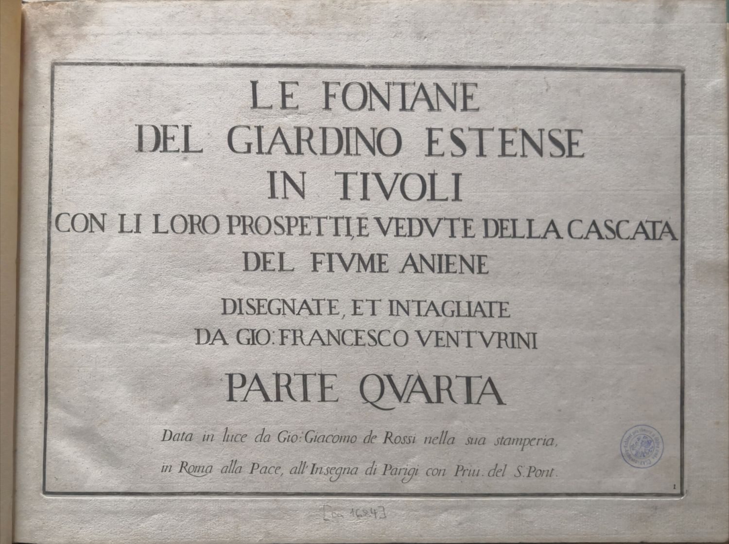Le Fontane del Giardino Estense in Tivoli con li loro prospetti, e vedute della cascata del fiume Aniene. Designate, et intagliate da Gio. Francesco Venturini. Parte Quarta. Data in luce da Gio. Giacomo de Rossi nella sua stamperia, in Roma alla Pace, all´Insegna di Parigi con Priu. del S. Pont.