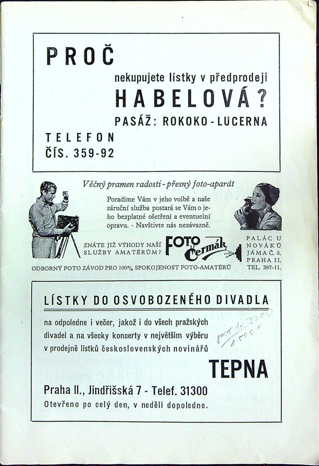 Původní obálka s fotograf. vyobrazením V+W na přední straně. Přední strana obálky při vnějším okraji v délce cca 5 cm potrhaná a při horním vnějším okraji přehnutá. Knižní blok spojený dvěma kovovými svorkami (původní adjustace).