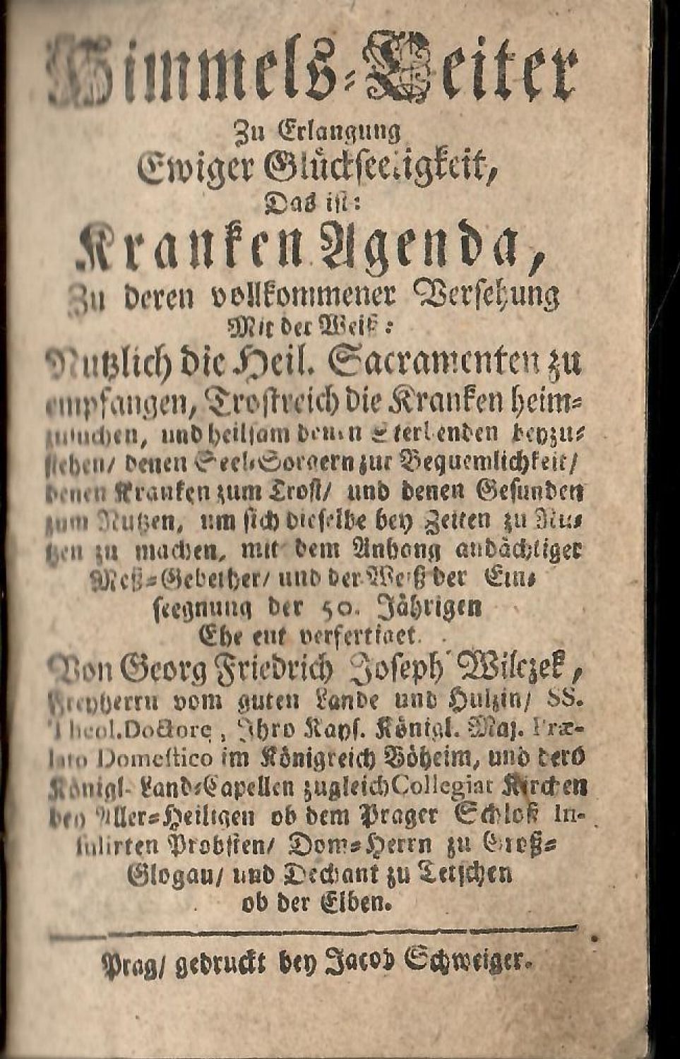Himmels=Leiter Zu Erlangung Ewiger Glückseeligkeit, Das ist: Kranken Agenda, Zu derten vollkommener Versehung Mit der Weiss: Nutzlich die Heil. Sacramenten zu empfangen, Trostreich die Kranken heimzusuchen, und heilsam denen Sterbenden beyzusteden/ denen Seel=Sorgern zur Bequemlichkeit/ denen Kranken zum Trost/ und denen Gesunden zum Nutzen, um sich dieselbe bey Zeiten zu Nutzen zu machen, mit dem Anhang andächtiger Mess=Gebether/ und der Weiss der Eins seegnung der 50. Jährigen Ehe ent verfertiget Von Georg Friedrich Joseph Wilczek, Freyherrn vom guten Lande und Hulzin/ .........