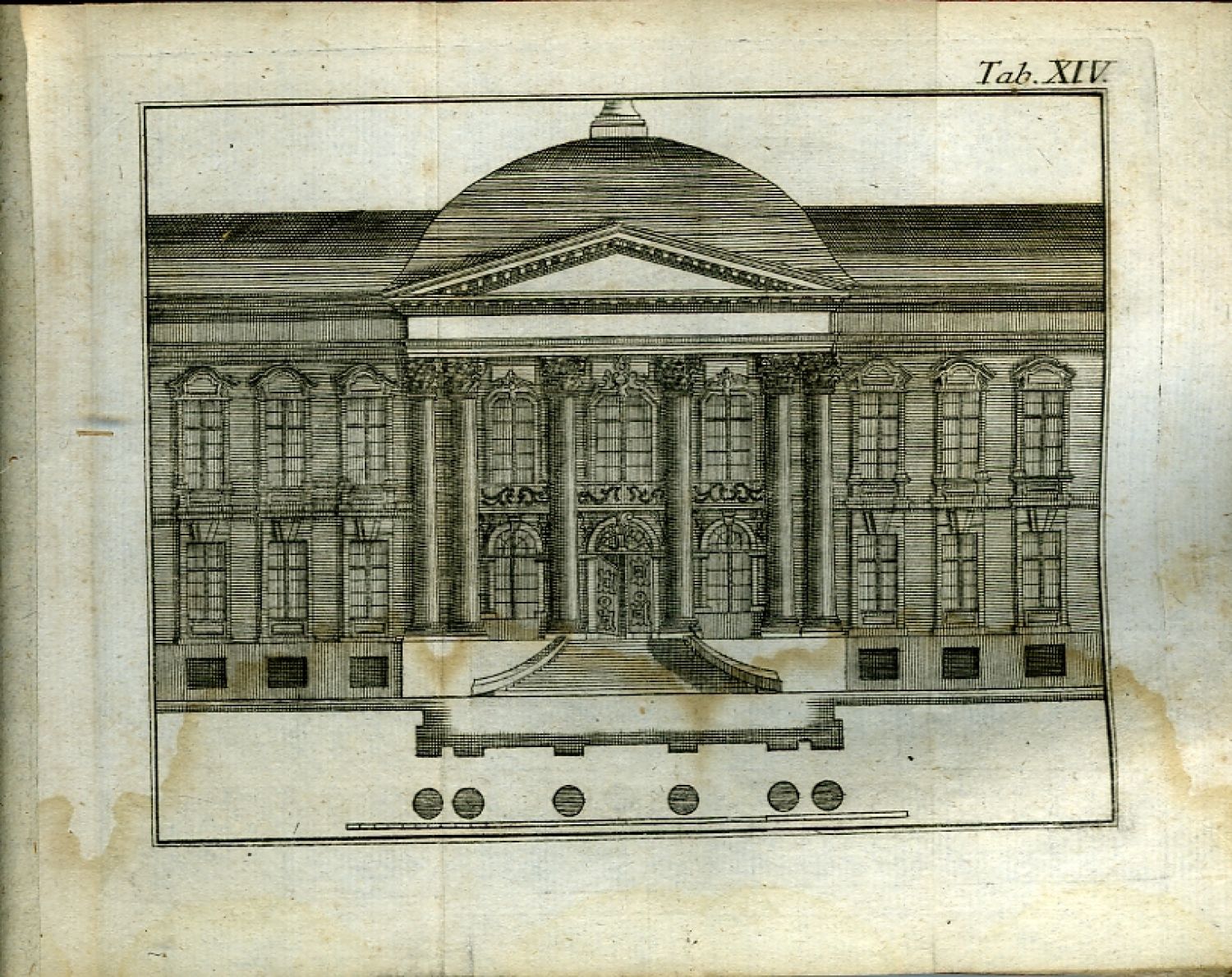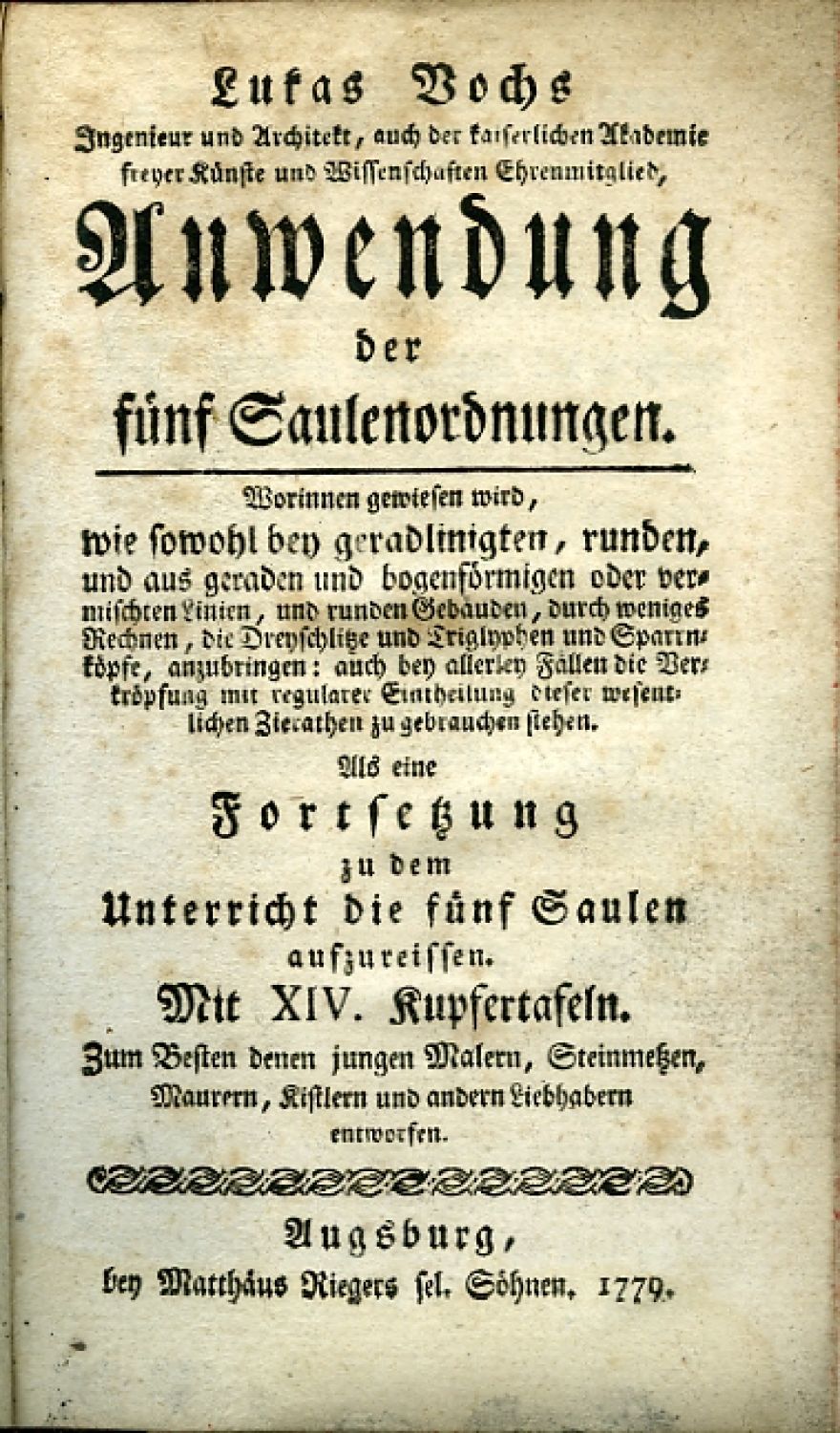 Anwendung der fünf Saulenordnungen. Worinnen gewiesen wird, wie sowohl bey geradlinigten, runden, und aus geraden und bogenförmigen oder vermischten Linien, und runden Gebäuden, durch weniges Rechnen, die Dreyschlitze und Triglyphen und Sparrnköpfe, anzubringen: auch bey allerley Fällen die Vertröpfung mit regularer Eintheilung dieser wesentlichen Zierathen zu gebrauchenen stehen. Als eine Fortsetzung zu dem Unterricht die fünf Saulen aufzureisten. Mit XIV. Kupfertafeln. Zum besten denen jungen Malern, Steinmetzen, Maurern, Kistlern und andern Liebhabern entworfen.