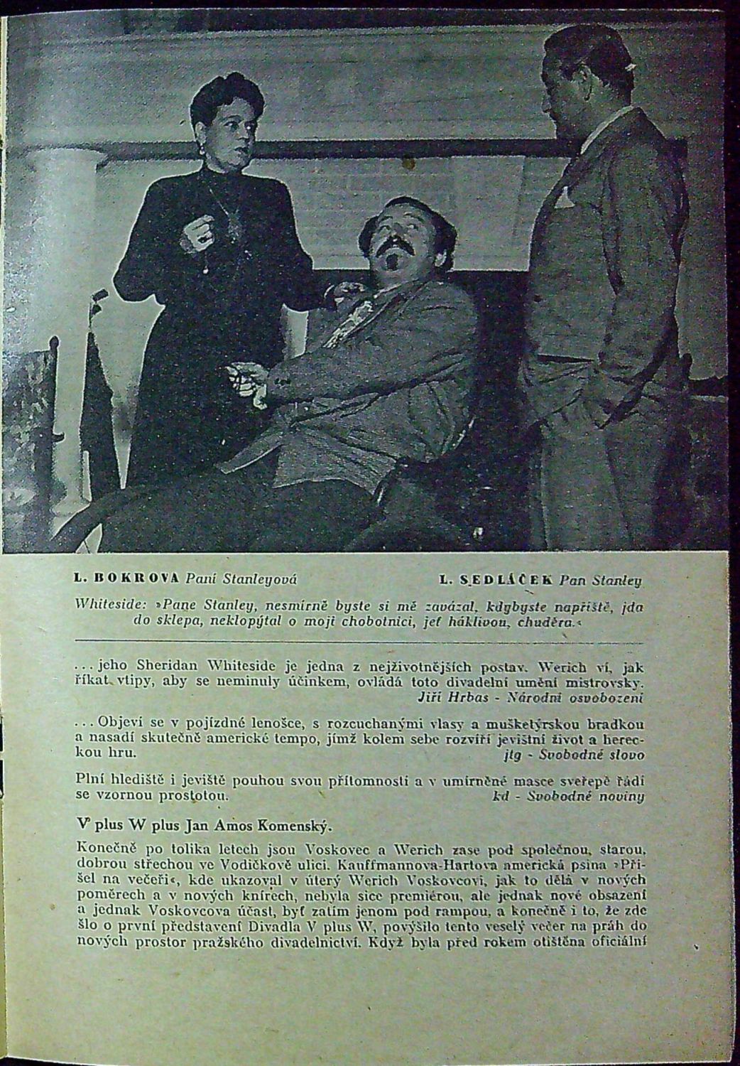 Na přední straně obálky fotografie V+W, v textu 15 fotograf. vyobrazení. V úvodu krásná vzpomínka Jiřího Voskovce na Jaroslava Ježka nazvaná "Nejkrásnější Ježkova píseň". Volně vložený program představení z listopadu 1946. Původní obálka na přední straně při spodním okraji lehce natržená (cca 0,5 cm).